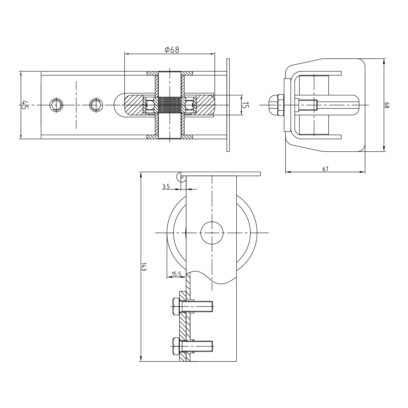 La conception du chariot élimine les forces obliques agissant sur les roulements — il en résulte un fonctionnement plus silencieux et une fiabilité accrue. Le réglage de la position du chariot s'effectue sur les ancrages de fondation par l'ajout de cales.