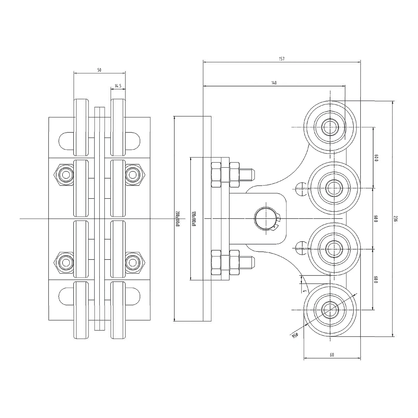 - Chariot roulant – 2 pcs (8 galets en acier sur deux niveaux, roulements à billes 6201 RS)