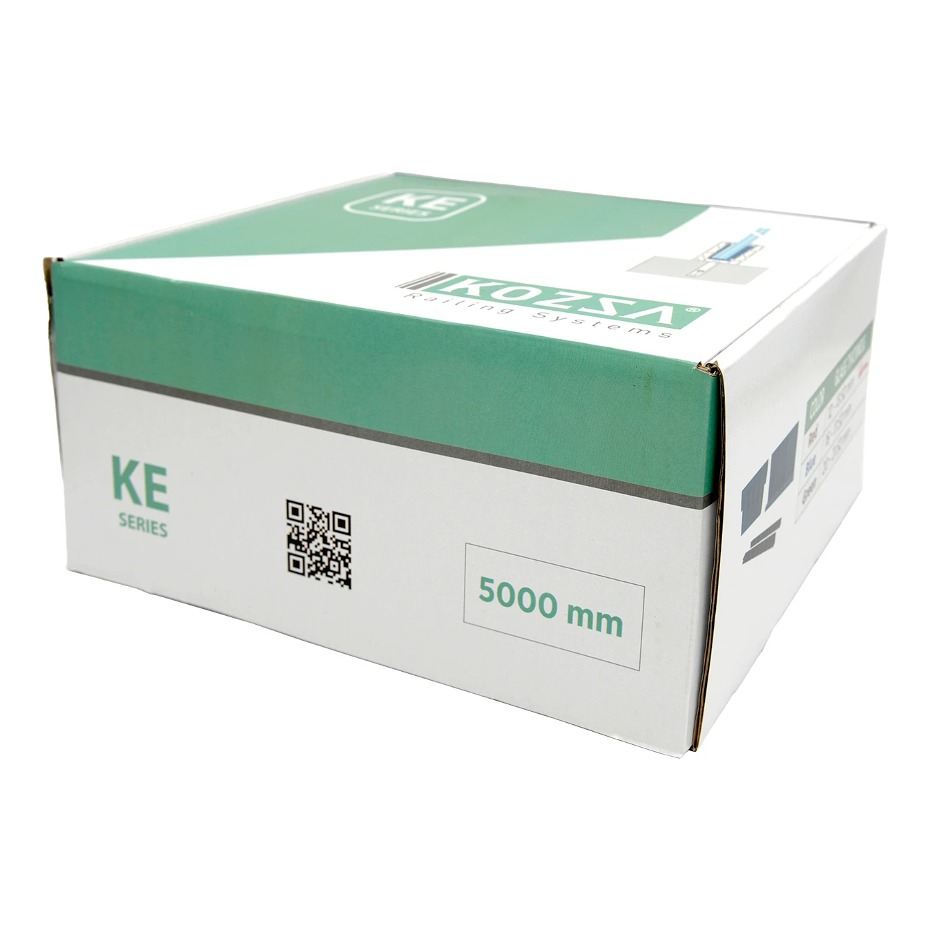 Les joints en caoutchouc diffèrent par leur profil de section — le joint avant (plus étroit) et le joint arrière (plus large) sont dédiés à des côtés spécifiques du profilé. Les éléments d'espacement en plastique, dotés de nervures de renforcement, sont répartis uniformément sur la longueur du rail, ce qui évite les contraintes ponctuelles sur le verre et assure son positionnement stable. L'ensemble du kit est livré dans un emballage cartonné, facilitant le stockage et le transport sur le chantier.