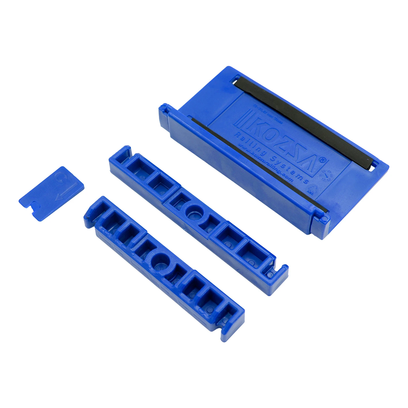 Le kit comprend 15 jeux d'éléments de fixation en plastique, répartis uniformément sur toute la longueur du profilé. Chaque jeu se compose d'une embase repérée A et B ainsi que d'une cale d'écartement, ce qui facilite une pose correcte et garantit la répétabilité sur chaque installation. Les éléments sont fabriqués en matière plastique résistante — ils résistent aux déformations et assurent une fixation fiable du panneau de verre aussi bien latéralement que par le dessus du profilé.
