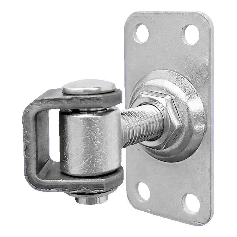 La plaque rectangulaire de dimensions 75 × 37 mm possède 4 trous Ø7 mm répartis symétriquement avec un entraxe de 21 × 59 mm, permettant une fixation sûre sur poteau en acier ou maçonné. L'épaisseur de plaque de 2,5 mm assure la rigidité tout en conservant un profil bas. L'axe fileté M12 avec écrou de réglage permet un réglage précis de la saillie de la charnière, ce qui est particulièrement important lors du montage de portails sur sol irrégulier ou lors de corrections géométriques après la pose des poteaux.