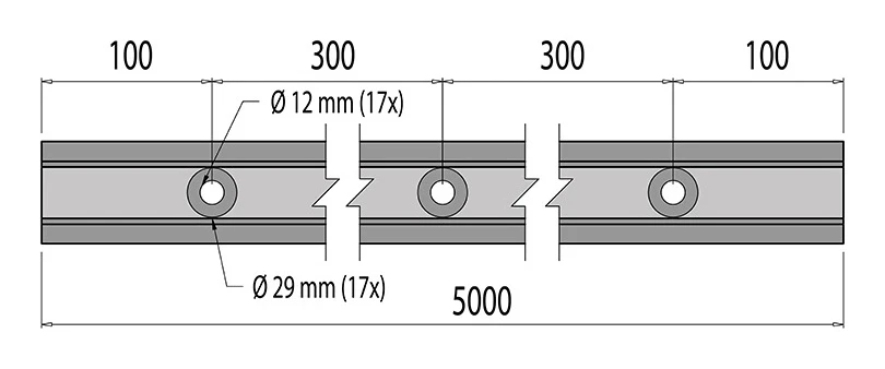 Le profilé possède 17 trous de montage répartis uniformément sur toute la longueur 5000 mm. Les trous traversants ont un diamètre de Ø 12 mm avec des évidements Ø 29 mm. L'espacement des axes des trous est de 300 mm, et la distance du bord du profilé à l'axe du premier et dernier trou est de 100 mm.