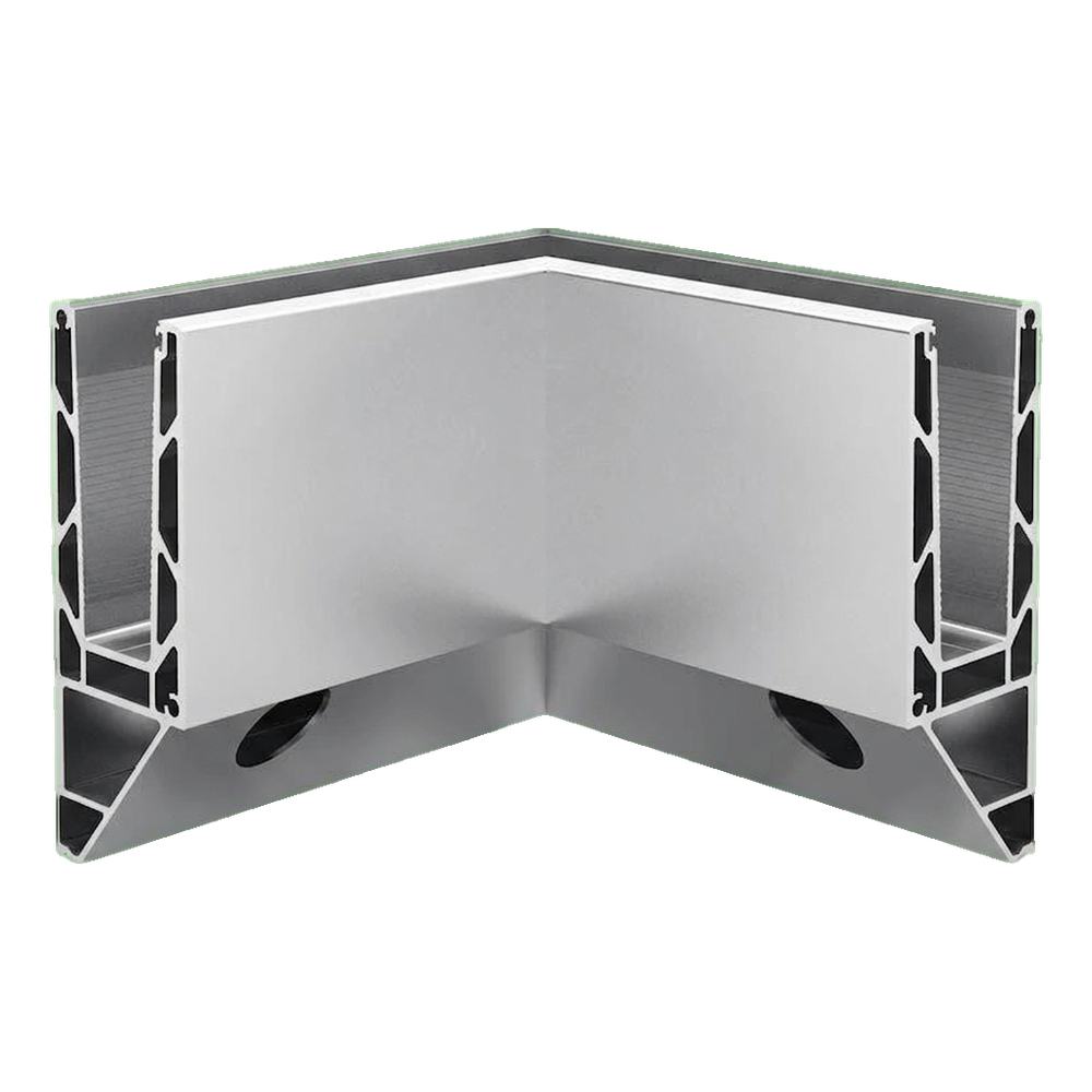 Profilé en U d'angle intérieur 90° de la série Kozza KE 120 destiné à la construction de balustrades tout verre en système plat. L'élément assure une connexion esthétique et durable de deux panneaux de verre à angle droit, idéal pour la finition des angles intérieurs sur les balcons, terrasses, cages d'escalier et mezzanines.