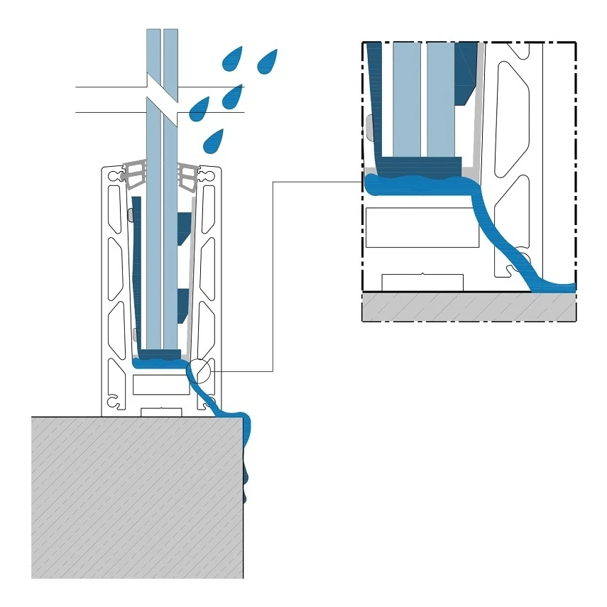 L'une des caractéristiques clés du profilé KF 1000 est le système de drainage intégré. L'eau de pluie qui pénètre à l'intérieur du profilé est efficacement dirigée vers l'extérieur — cela élimine le problème de stagnation d'humidité, de traces et de corrosion accélérée. Cette solution prolonge considérablement la durée de vie de tout le garde-corps et réduit les coûts de maintenance, ce qui est crucial notamment dans les projets exposés aux conditions atmosphériques.