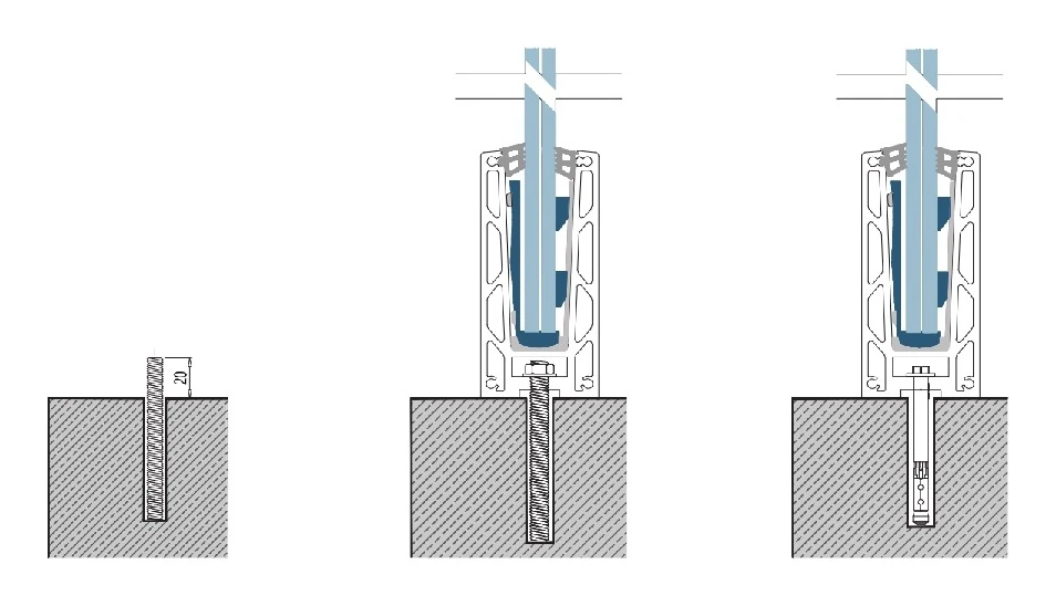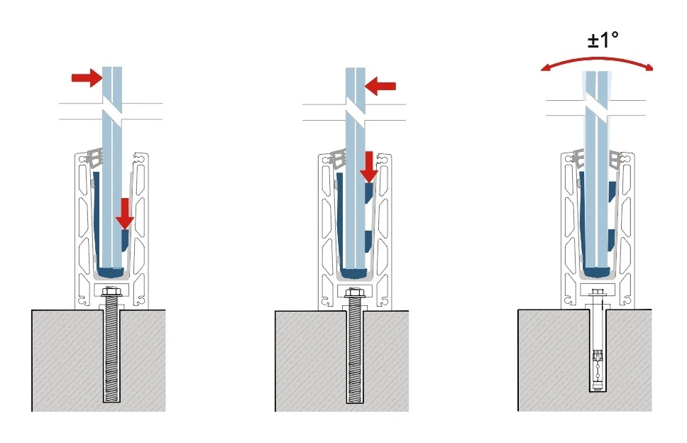 Le profilé se monte par le haut, ce qui facilite l'accès lors de l'installation et permet de dissimuler les éléments de fixation sous la finition du sol ou du plafond. Le système permet le réglage de la position du verre horizontalement ainsi que la correction d'inclinaison dans la plage de ±1°, permettant ainsi à l'installateur de positionner précisément la vitre même sur un support irrégulier. La profondeur d'ancrage de la cheville est de min. 20 mm.