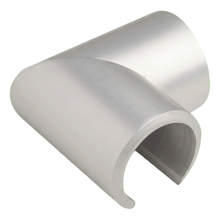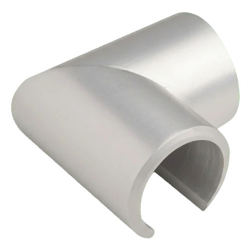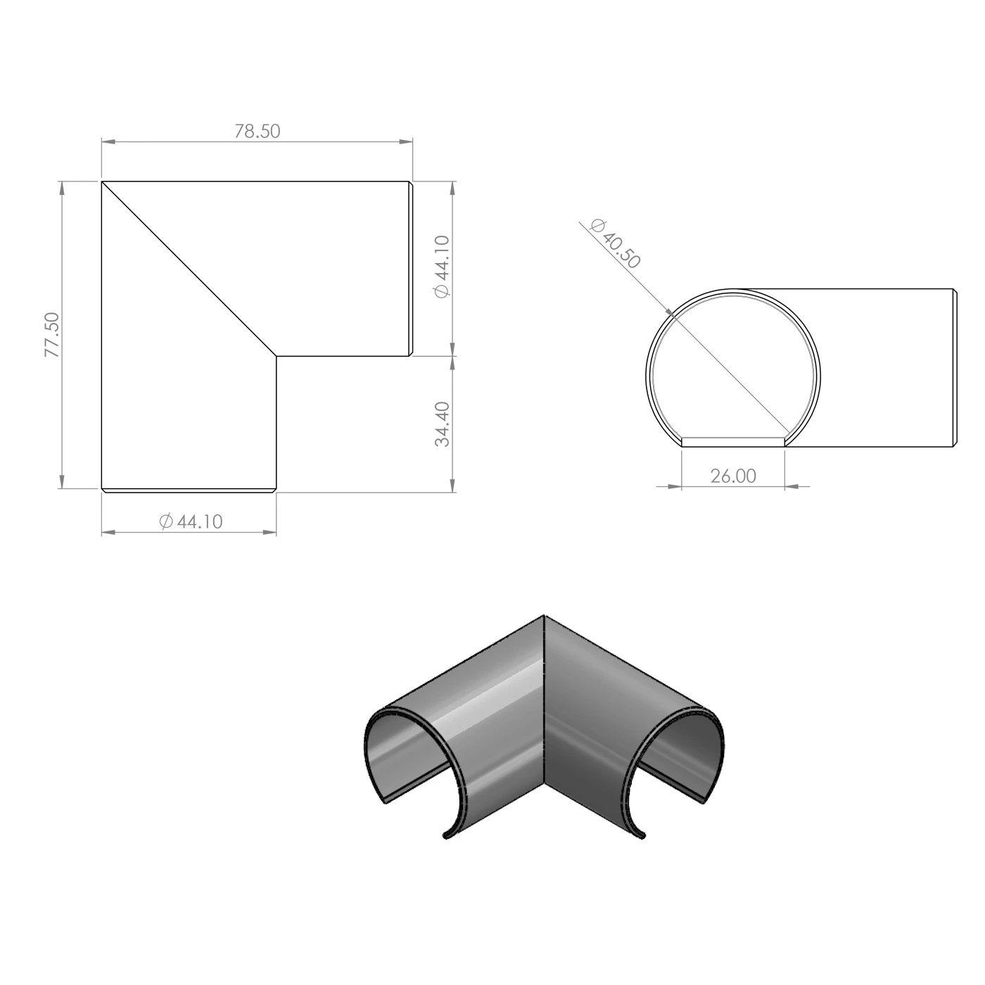 Le diamètre extérieur du connecteur est de 44,10 mm, ce qui garantit un emboîtement sûr sur les mains courantes fi 40 mm (diamètre intérieur 40,50 mm) et une transition esthétique et fluide sans décrochements visibles ou arêtes irrégulières. La longueur des bras – respectivement 78,50 mm et 77,50 mm – assure un support solide de la connexion et une résistance aux charges résultant de l'utilisation quotidienne de la main courante. La fente de montage d'une largeur de 26 mm permet un glissement facile de l'élément sur le bord du panneau de verre et un montage rapide.