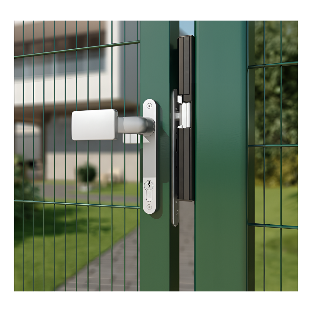 Les vis de fixation et entretoises incluses permettent l'installation sur des profilés de largeur de 37 mm à 65 mm, ce qui signifie une compatibilité avec la plupart des poteaux de clôture populaires — tant des profilés fermés que des poteaux de système pour panneaux de clôture. L'entraxe entre l'insert à barillet et l'axe de la poignée est de 92 mm, ce qui correspond au standard le plus couramment utilisé pour les serrures encastrées de portails et portillons.