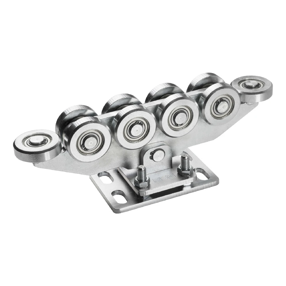 Chariot conçu pour les portails coulissants autoportants lourds. Équipé de 10 galets en acier (dont deux galets horizontaux), qui assurent un déplacement fluide et silencieux même sous forte charge. Construction oscillante – le chariot est relié à la base par un pivot, ce qui lui permet de s'adapter automatiquement au profil du rail.