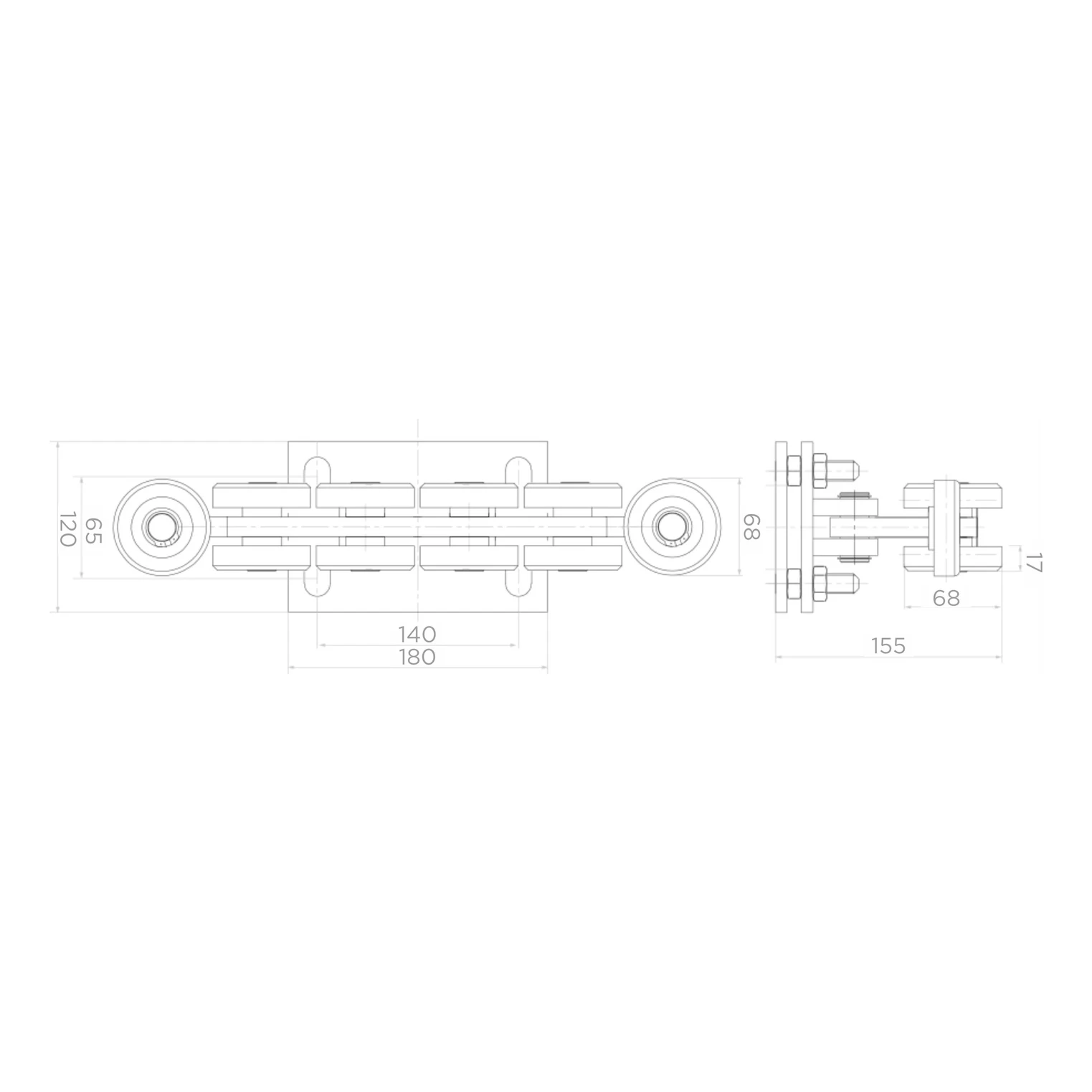 Contenu de l'ensemble : deux chariots de roulement 80 (à 10 galets) – 2 pcs, support de butée – 1 pc, galet de montée – 1 pc. Tous les éléments sont galvanisés, ce qui garantit une haute résistance à la corrosion et une longue durée de vie en conditions extérieures.