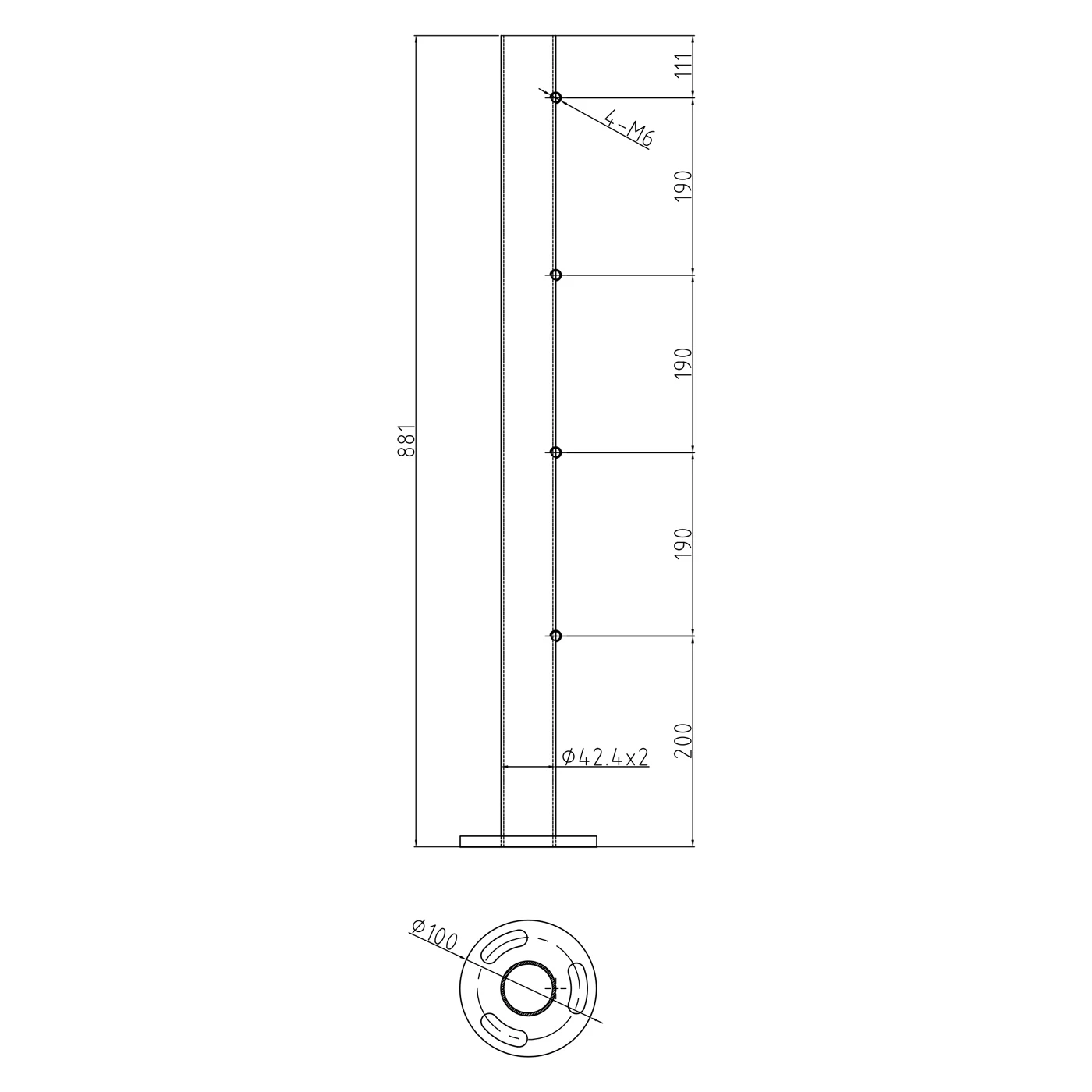 La base de montage soudée d'un diamètre de ø100 mm avec trois trous oblongs répartis tous les 120° se fixe directement au sol. Ce mode de montage garantit la stabilité et la sécurité de la construction même dans les endroits à forte circulation, tels que les escaliers dans les bâtiments publics, les hôtels ou les immeubles de bureaux.