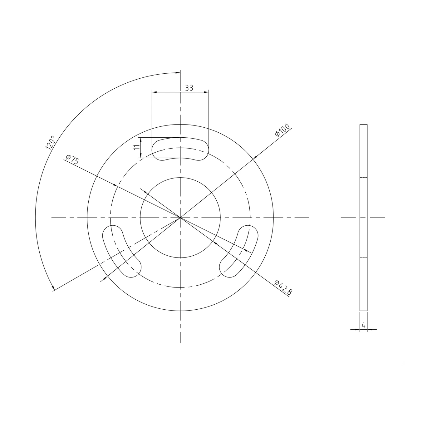 - Trous dans la platine : 3 pcs (haricots 33 × 11 mm) sur cercle ø75 mm, tous les 120°