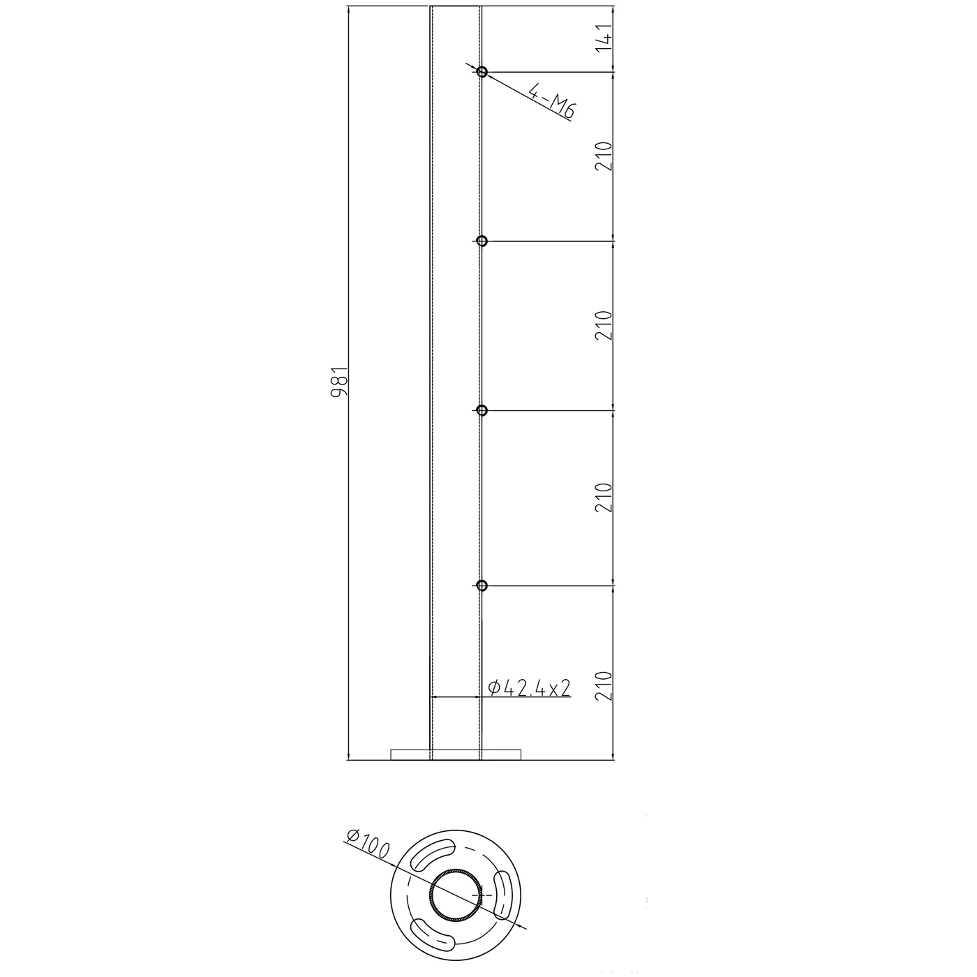 Le poteau est de type non équipé — il possède 4 trous taraudés M6 répartis à intervalles égaux de 210 mm, ce qui permet le libre choix et montage de tous supports de barres, tubes ou remplissages. Grâce à cela, l'installateur dispose d'une flexibilité complète dans la configuration de la balustrade selon le projet spécifique.