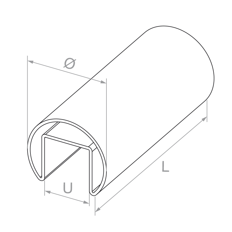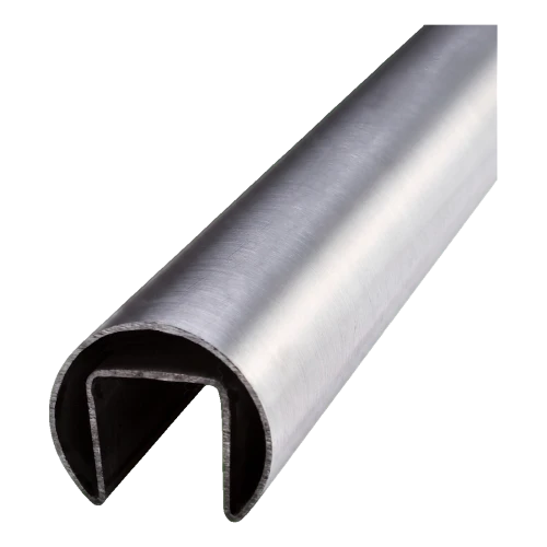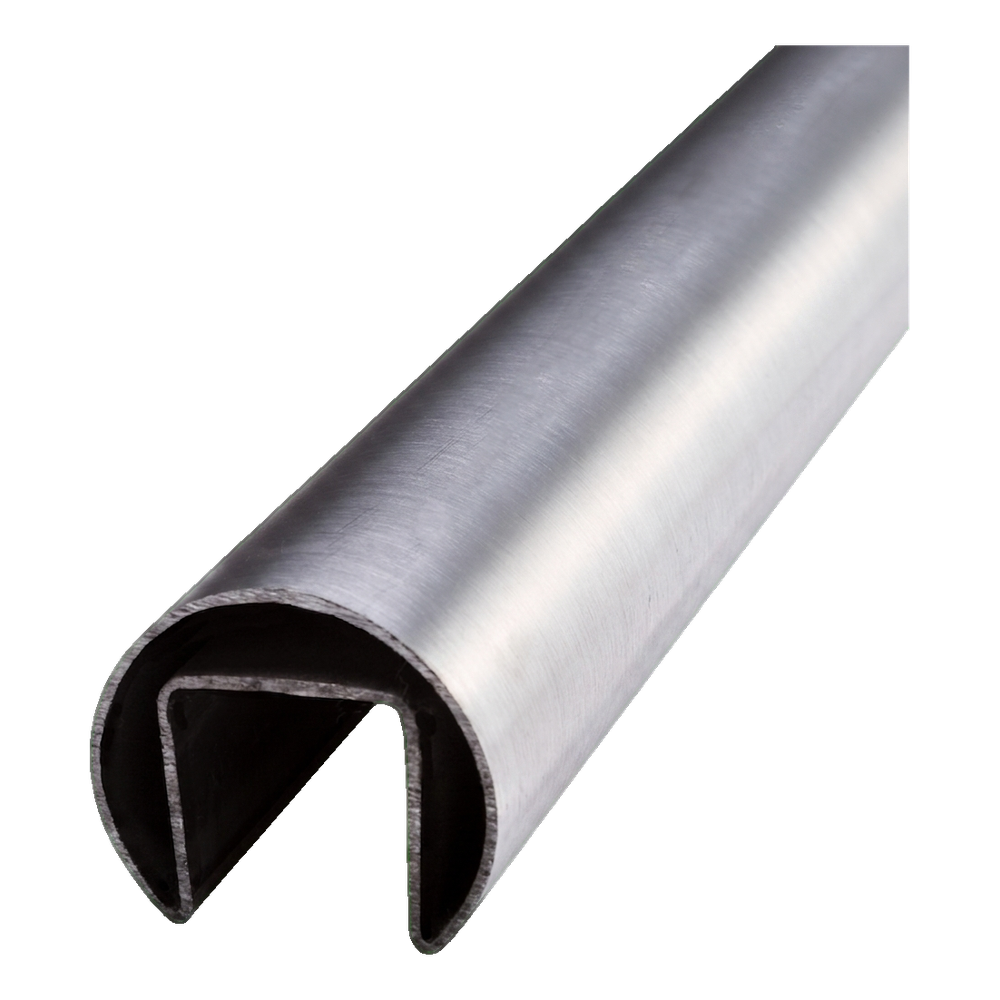 Main courante rapportée sur verre d'un diamètre de ø 42,4 mm et d'une longueur de 5000 mm — élément de finition professionnel pour balustrades entièrement vitrées. Fabriquée en acier inoxydable AISI 304 avec finition satinée, elle allie élégance, durabilité et résistance à la corrosion. Grâce au profil en forme de U d'une largeur de 24 mm, elle s'adapte au verre d'une épaisseur de 8 à 21,52 mm, assurant une large compatibilité avec les configurations populaires de balustrades vitrées.