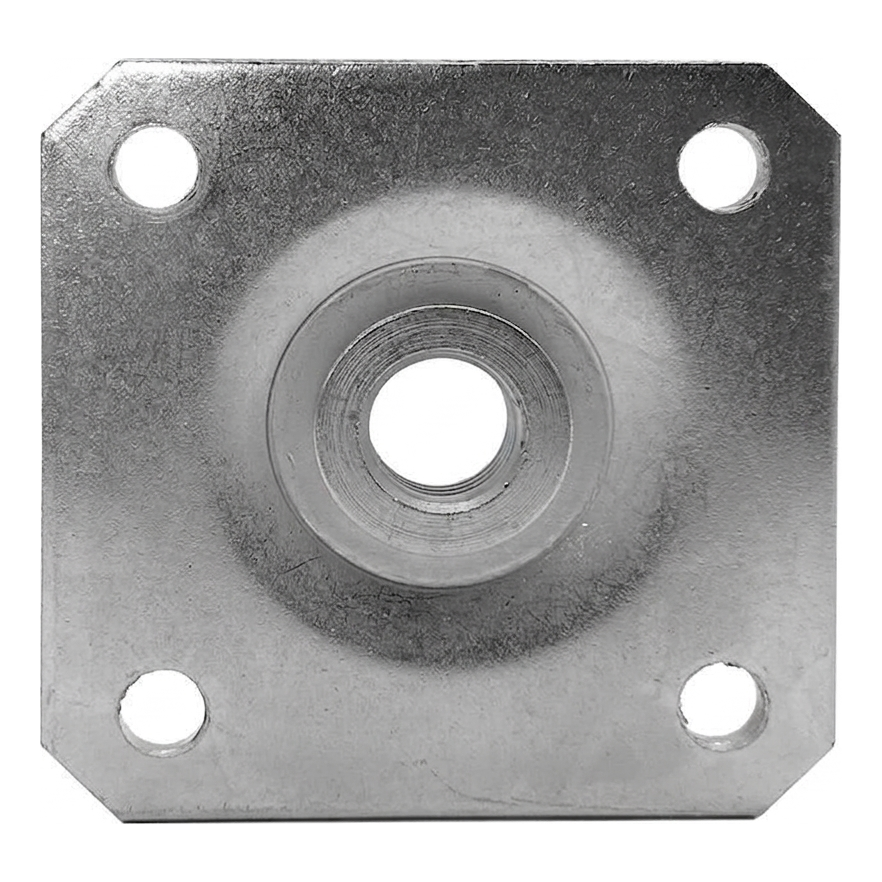 L'écrou M16 soudé au centre permet un vissage rapide de la tige de charnière réglable — sans nécessité d'utiliser des éléments de fixation supplémentaires. Les angles coupés de la plaque facilitent l'adaptation aux profils des poteaux de clôture, et l'épaisseur de 3 mm assure une rigidité et une capacité portante appropriées de la connexion. La plaque est prête pour un montage immédiat — il suffit de la visser au poteau avec quatre vis et de visser la tige de charnière.