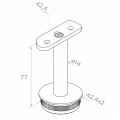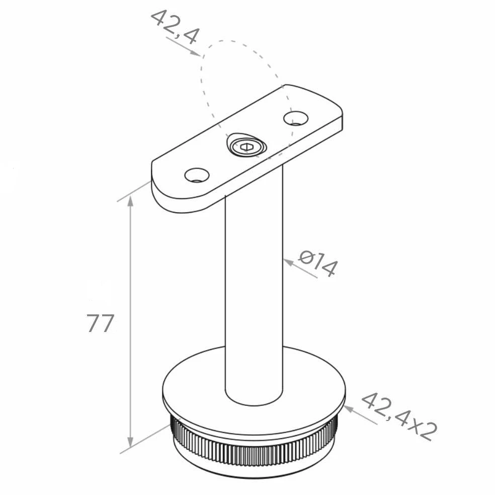 La construction du support est adaptée au système de balustrade 42,4 mm. La partie inférieure avec bord moletté est enfoncée dans le tube du poteau de dimension 42,4 × 2 mm (diamètre extérieur × épaisseur de paroi), et la sellette supérieure avec courbure profilée s'adapte à la main courante de diamètre 42,4 mm. La tige verticale de diamètre ø14 mm assure la rigidité appropriée de toute la connexion.