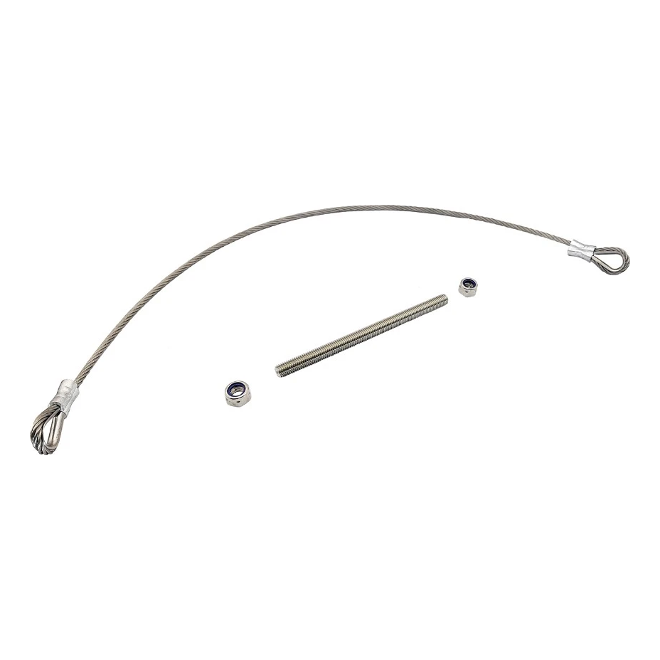 Le kit est prêt au montage — il contient le câble en acier avec des boucles saumurées aux deux extrémités, une tige filetée M12 et deux écrous de sécurité. Grâce à cela, l'entreprise d'installation n'a pas besoin de compléter des éléments de fixation supplémentaires, ce qui raccourcit le temps de réalisation de la commande et simplifie la logistique.