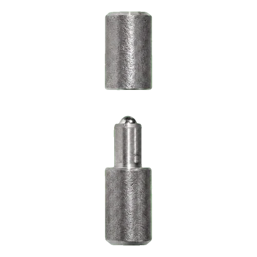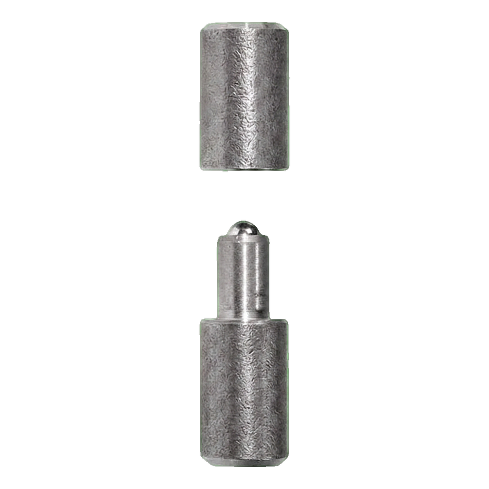 La charnière se compose de deux éléments : le manchon supérieur (femelle) et l'axe avec bille (mâle), qui une fois assemblés forment un point de rotation compact et sûr. L'extrémité sphérique de l'axe minimise la friction et facilite la suspension du vantail — il suffit de glisser le manchon sur l'axe. Cette solution est particulièrement appréciée par les équipes de montage, car elle réduit considérablement le temps d'installation des portails et portillons.
