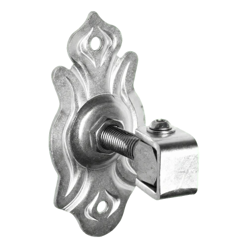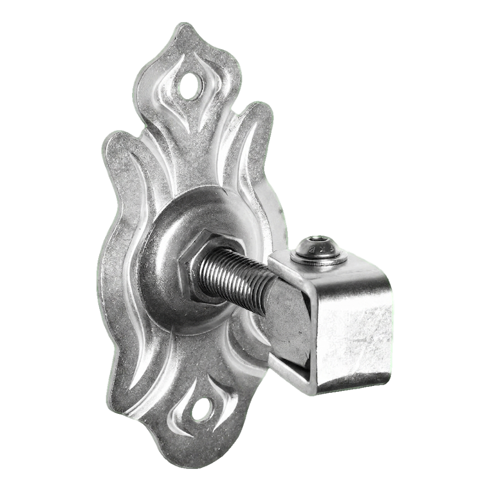 Charnière réglable en acier avec plaque décorative destinée au montage de portails et portillons. La vis M16 avec écrou de réglage permet une correction précise du positionnement du vantail à tout moment — aussi bien juste après le montage qu'en cours d'utilisation, par exemple lorsque l'influence de basses températures ou l'affaissement de la construction nécessite un nouveau réglage.