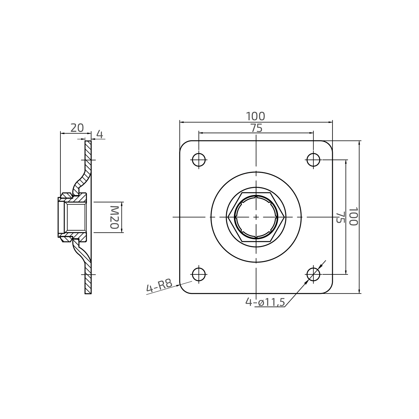 PSG écusson pour charnière réglable M20 – acier inoxydable AISI 304, 100×100 mm