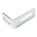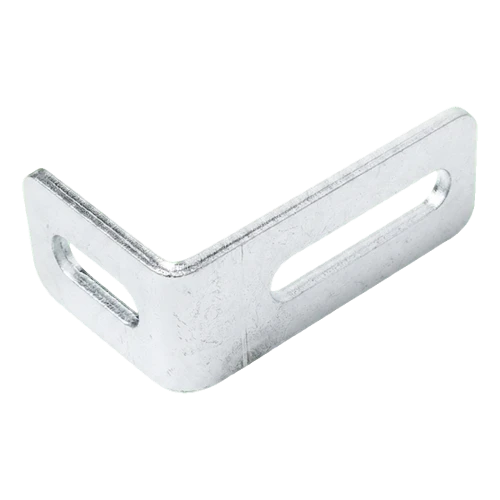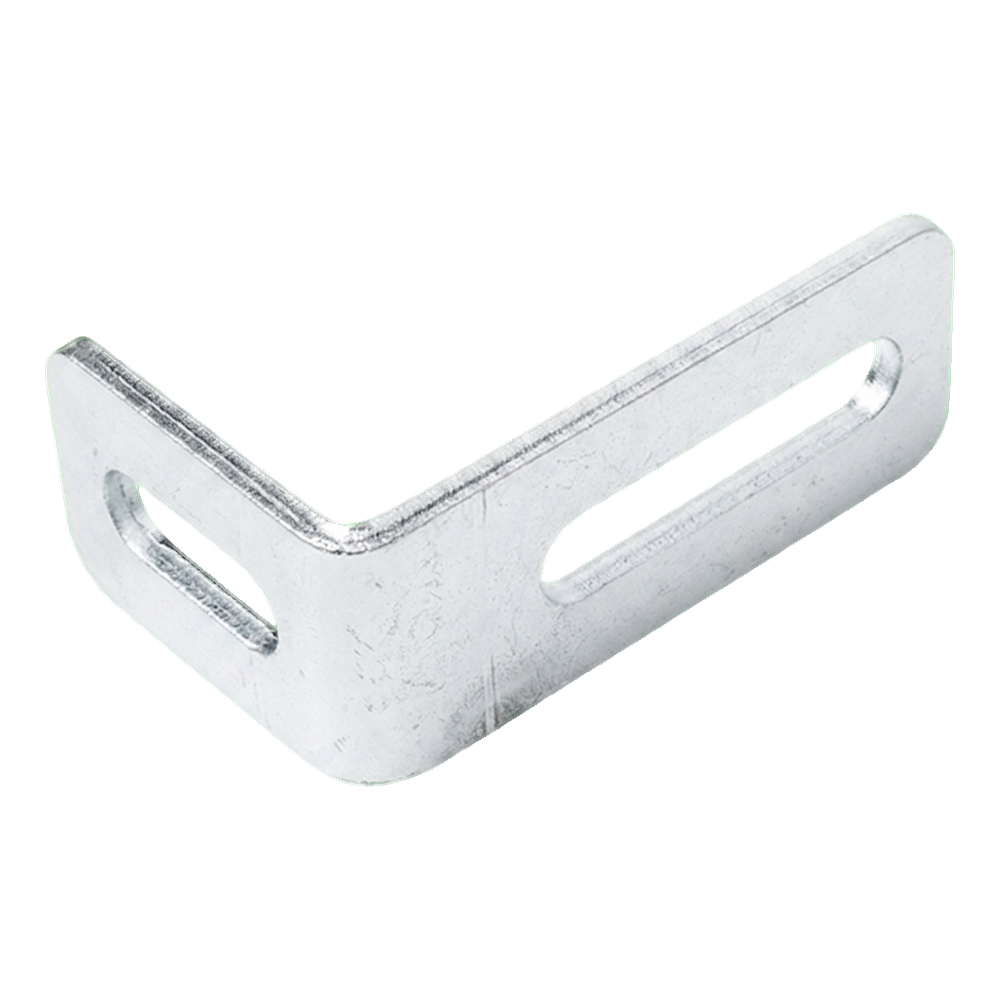 L'équerre sert à fixer la roulette de guidage sur le poteau du portail coulissant autoportant. Les trous ovales de réglage sur les deux bras permettent un ajustement fin de la position de la roulette par rapport au profil de roulement du portail — sans nécessité de percer de nouveaux trous. C'est un avantage important lors des montages où un réglage précis du guidage du vantail du portail est requis.