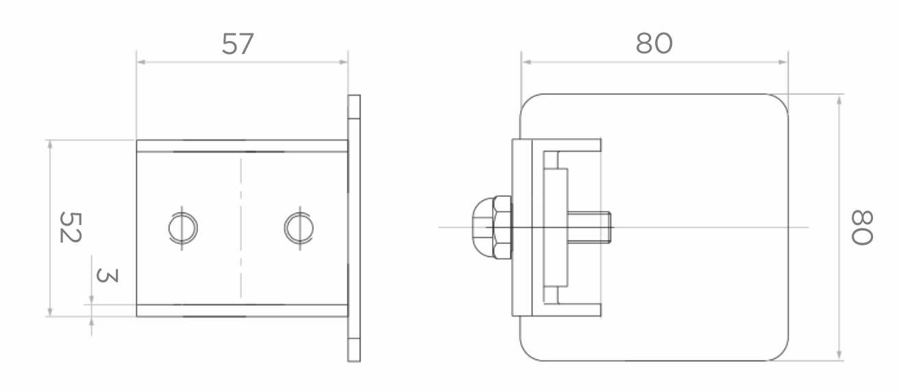 L'élément se compose d'une plaque frontale 80×80 mm et d'une partie à insérer d'une longueur de 57 mm, qui s'introduit directement dans la lumière du rail. La construction est simple et fonctionnelle — le montage consiste à insérer la finition dans le profil et à la serrer à l'aide des vis de montage fournies. Deux vis de serrage garantissent une fixation sûre et durable sans nécessité de soudure.