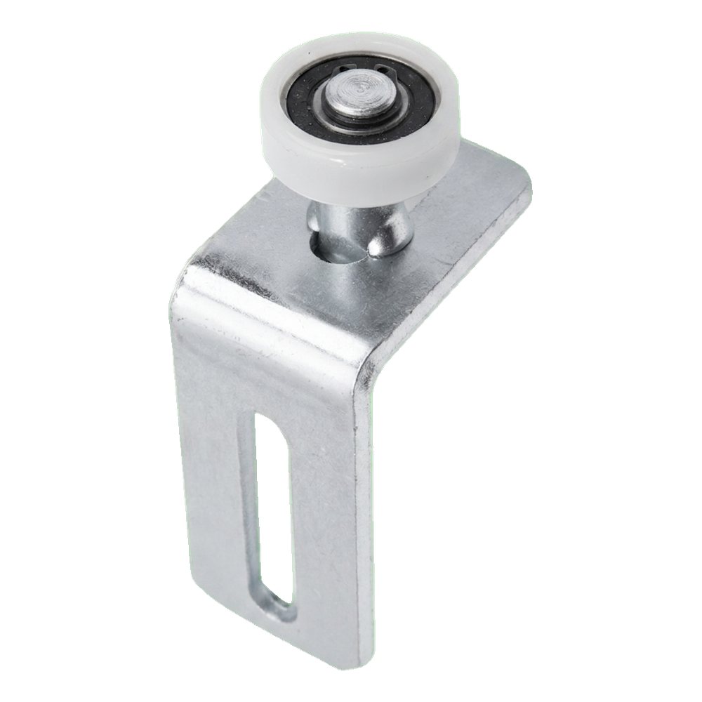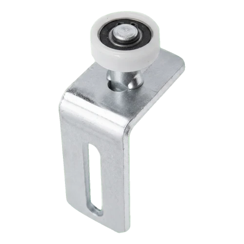 Le galet d'un diamètre de 35 mm a été fabriqué en matière plastique et monté sur roulement, ce qui assure un fonctionnement silencieux et léger ainsi qu'une longue durée de vie. L'ensemble comprend une cornière de montage avec trou oblong (boutonnière), qui permet le réglage de la position du galet et un montage rapide sur le poteau du portail.