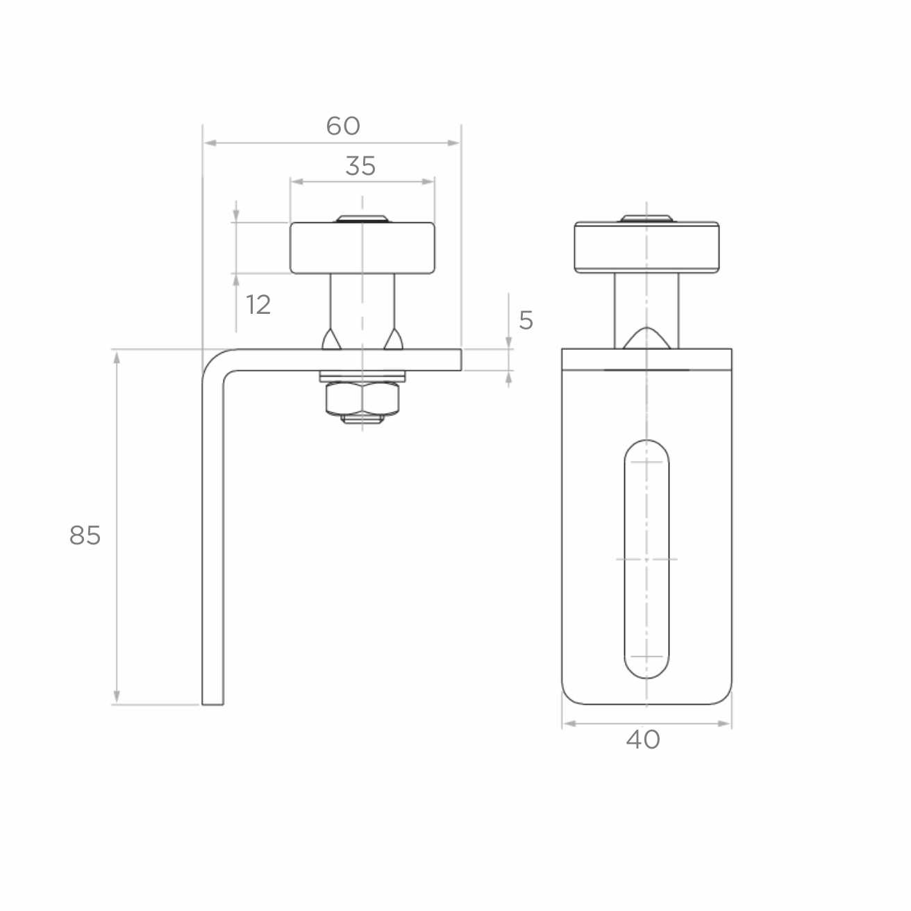Le galet de guidage se monte sur le poteau du portail coulissant à l'aide de la cornière fournie. Le bras vertical de la cornière (85 mm) se fixe au poteau, tandis que le bras horizontal (60 mm) s'étend vers le portail, maintenant le galet dans l'axe du rail de roulement. Le trou de montage oblong permet un réglage précis de la hauteur et de la position du galet, ce qui est particulièrement important lors de l'alignement du profilé de guidage en U.