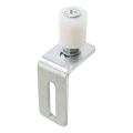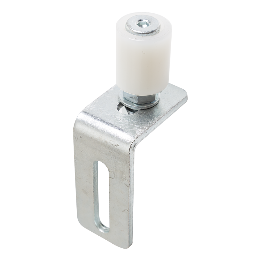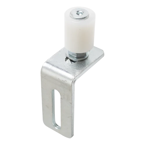 Le galet est livré avec une cornière de montage avec ouverture oblongue, permettant le réglage de position du galet en vertical. L'ouverture de réglage permet d'ajuster la hauteur de guidage du profilé en U sans nécessité de percer à nouveau des trous dans le poteau — c'est une facilitation significative lors du montage et de la maintenance du portail coulissant.