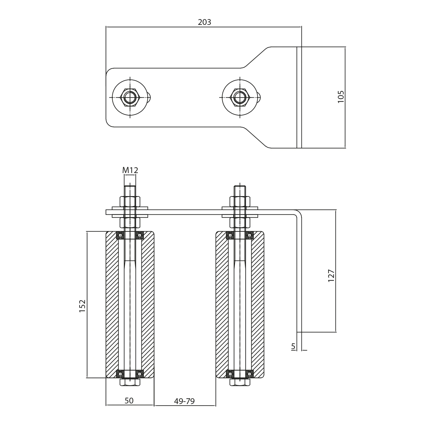 - Construction solide — tôle de 5 mm et vis M12 supportent des charges importantes