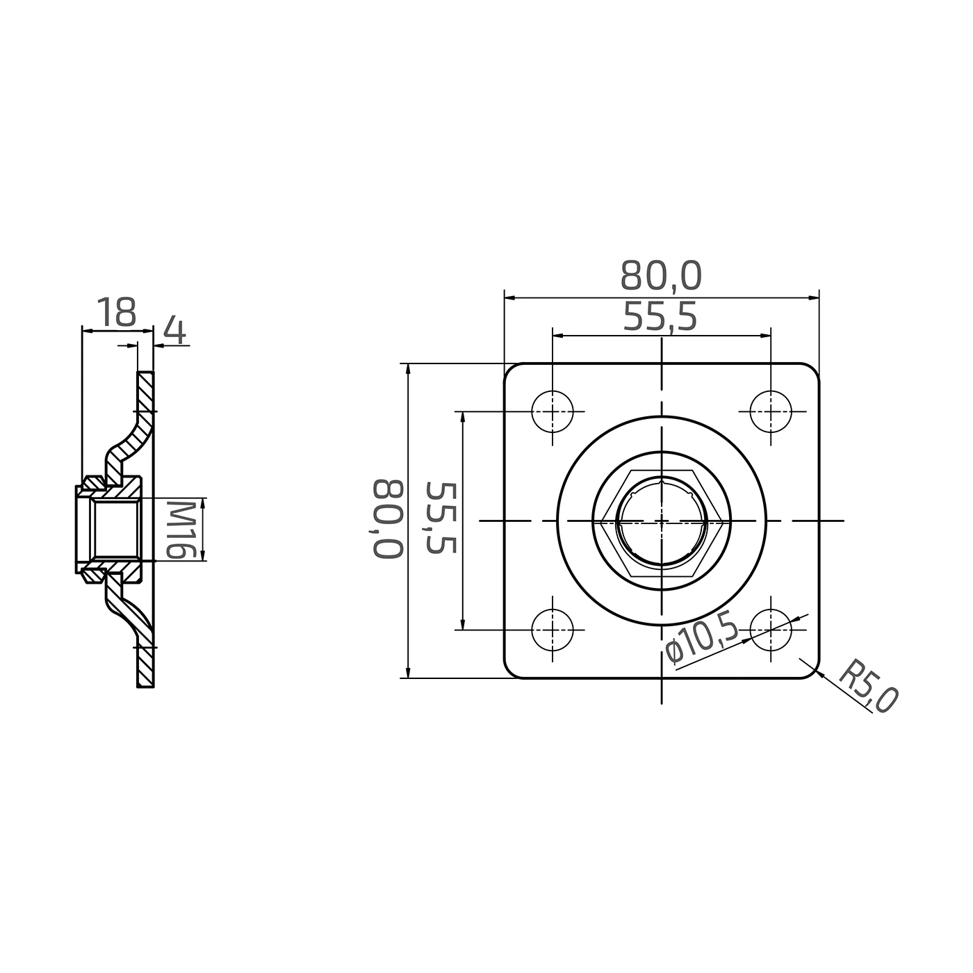 La plaque se monte à l'aide de quatre vis (dans les trous de diamètre ø10,5 mm) directement sur le poteau de portail ou le cadre de construction. L'entraxe des trous 55,5 × 55,5 mm permet une répartition stable des forces sur toute la surface de liaison. Dans l'écrou central se visse la tige de charnière réglable avec filetage M16, ce qui permet un réglage précis de la position du battant de portail après montage.