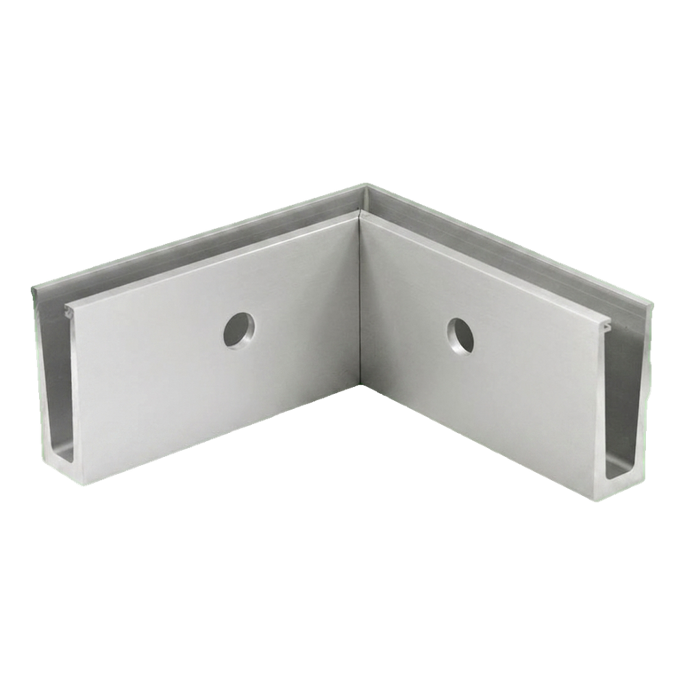Profil d'angle intérieur en aluminium pour balustrades tout verre (sans poteaux) avec montage latéral. Permet un déport esthétique de l'angle 90° lors du montage de verre trempé ou feuilleté. Grâce au système plat et à la surface brute de l'aluminium, le profil imite parfaitement l'aspect de l'acier inoxydable satiné, tout en restant plus léger et plus facile à usiner.