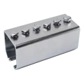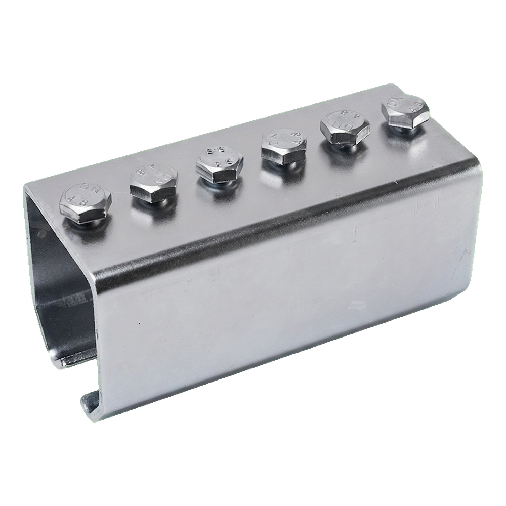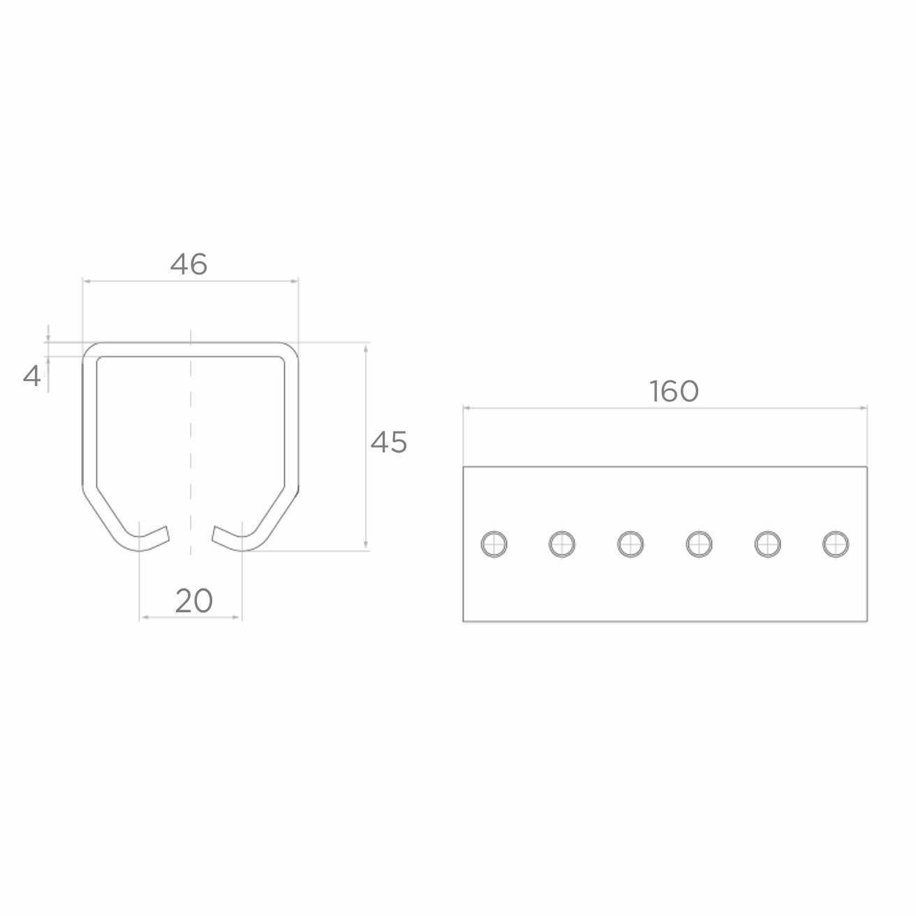 Le raccord se présente sous la forme d'une plaque d'acier embrassant le profil du rail des deux côtés, ce qui garantit une connexion rigide et stable même sous forte charge du portail. Six vis réparties uniformément sur la longueur de 160 mm assurent un serrage approprié et éliminent le risque de desserrage de la connexion pendant l'exploitation. Le revêtement galvanisé protège l'élément contre la corrosion, grâce à quoi le raccord convient aussi bien aux portails intérieurs de halls qu'aux applications exposées à l'humidité.