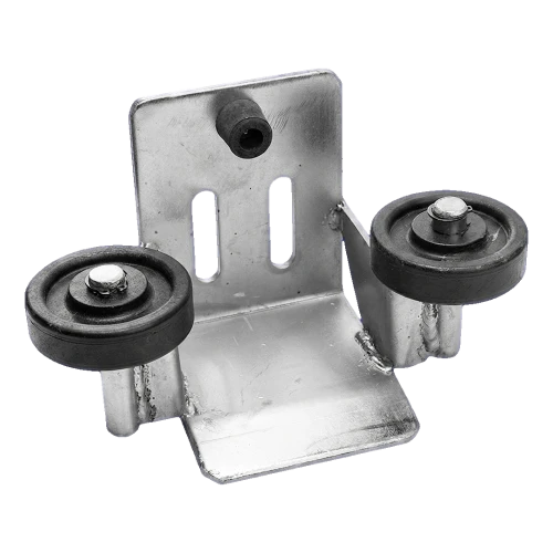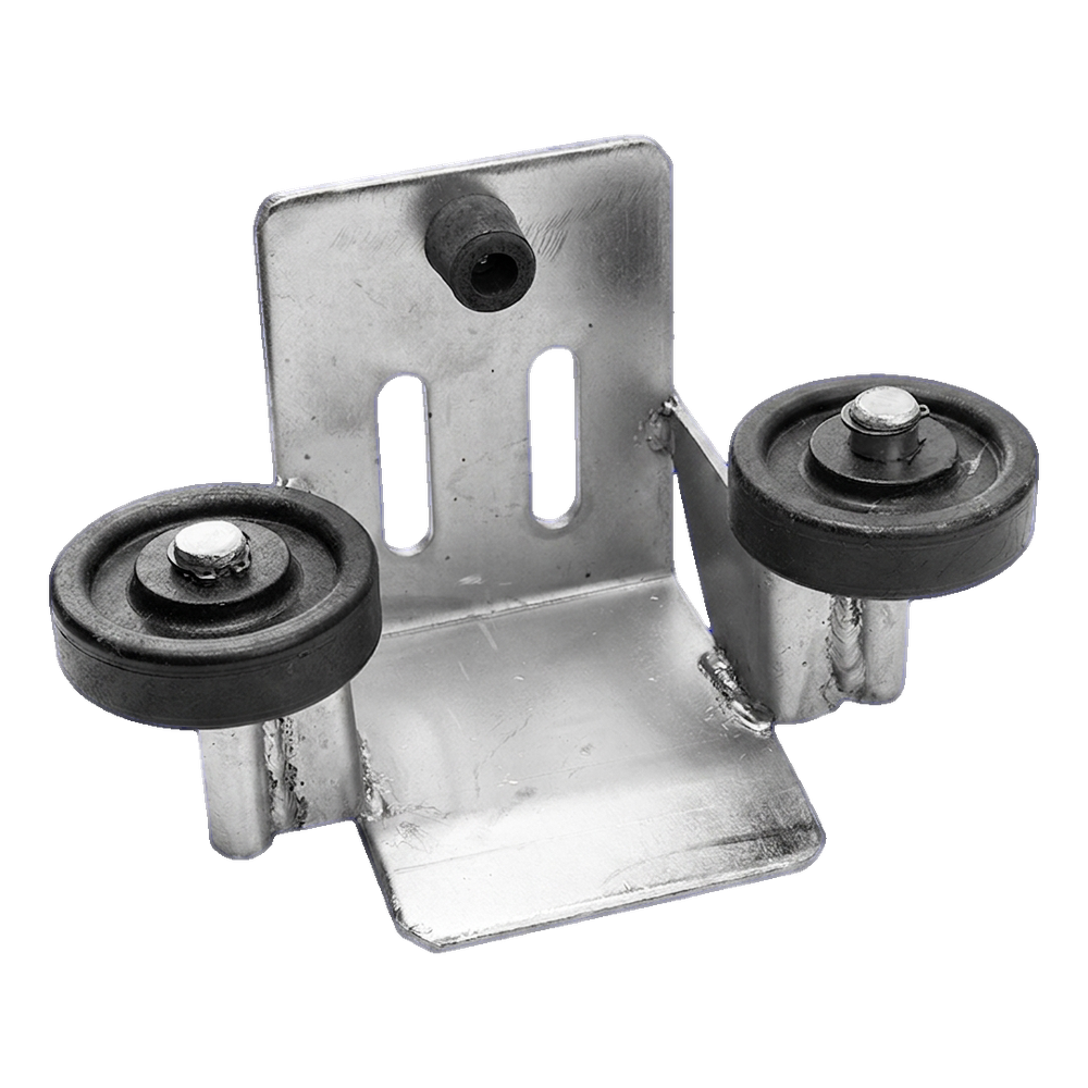 Le support est équipé de deux roulettes de guidage en matière plastique qui guident avec précision le portail lors de la fermeture, éliminant les frottements excessifs et les jeux latéraux. Sur la paroi arrière du support se trouvent deux trous de montage (trous oblongs traversants) permettant le réglage de la position, et un butoir en caoutchouc placé au centre amortit les chocs du vantail en position finale, protégeant à la fois le portail et le poteau.