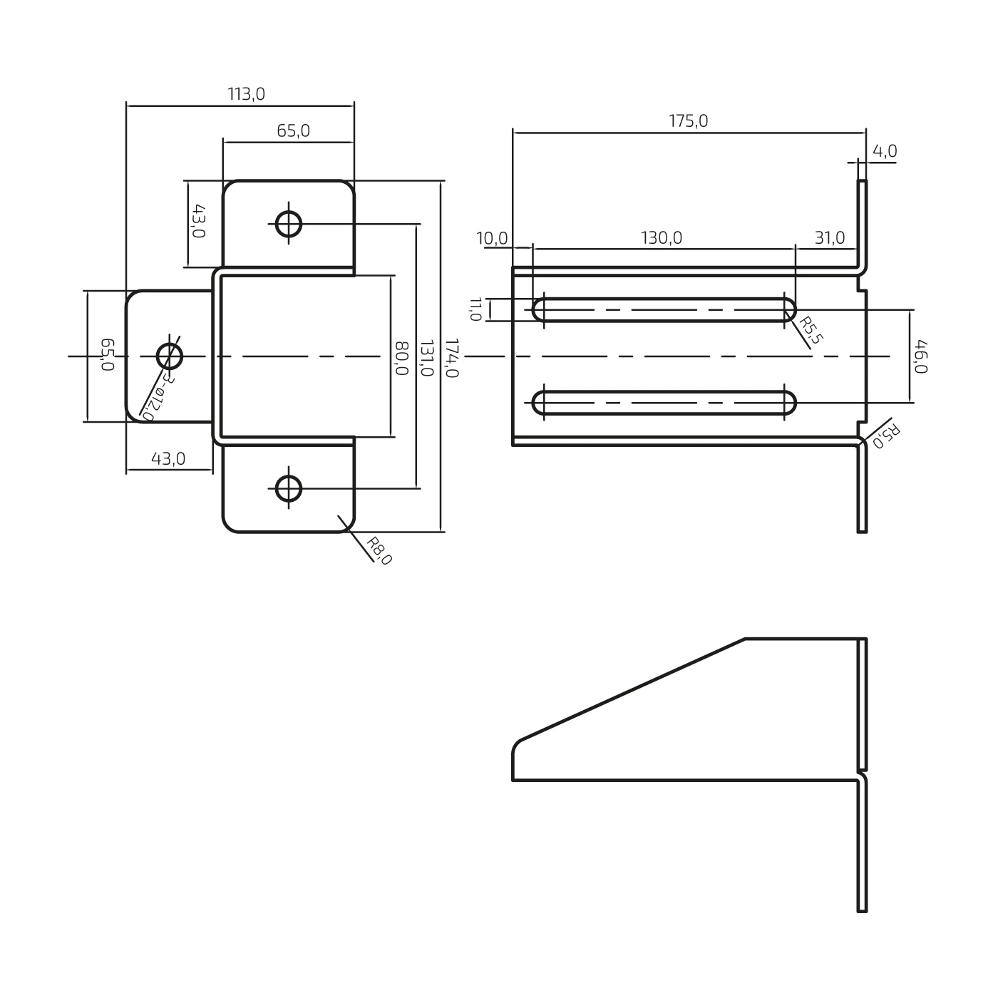 Le support convient au montage aussi bien sur des poteaux en acier qu'en béton. Les trous oblongs permettent un réglage précis de la position du logement de guidage d'entrée en horizontal, ce qui est particulièrement utile pour corriger l'axe du portail après la pose des poteaux. Les trois trous circulaires ⌀12 mm sur les brides assurent un ancrage sûr de l'élément au support.
