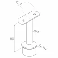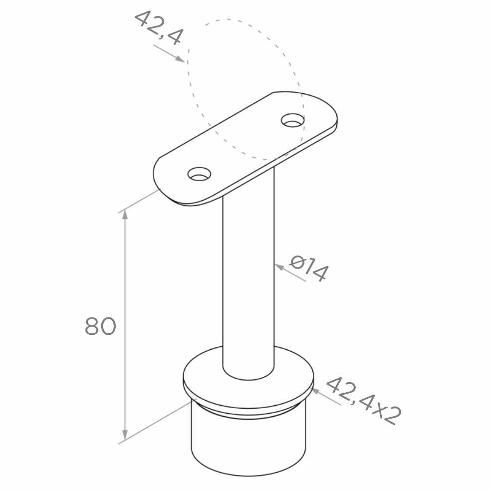 La base du support est adaptée au tube poteau de dimensions 42,4 × 2 mm (diamètre extérieur × épaisseur de paroi), et la sellette du haut reçoit la main courante de diamètre 42,4 mm. La construction compacte d'une hauteur de 80 mm et d'une tige ø14 mm assure une fixation rigide et stable de la main courante. L'acier inoxydable AISI 316 garantit une haute résistance à la corrosion — convient aussi bien à l'intérieur des bâtiments qu'à l'extérieur, y compris dans des environnements exposés au sel et à l'humidité.