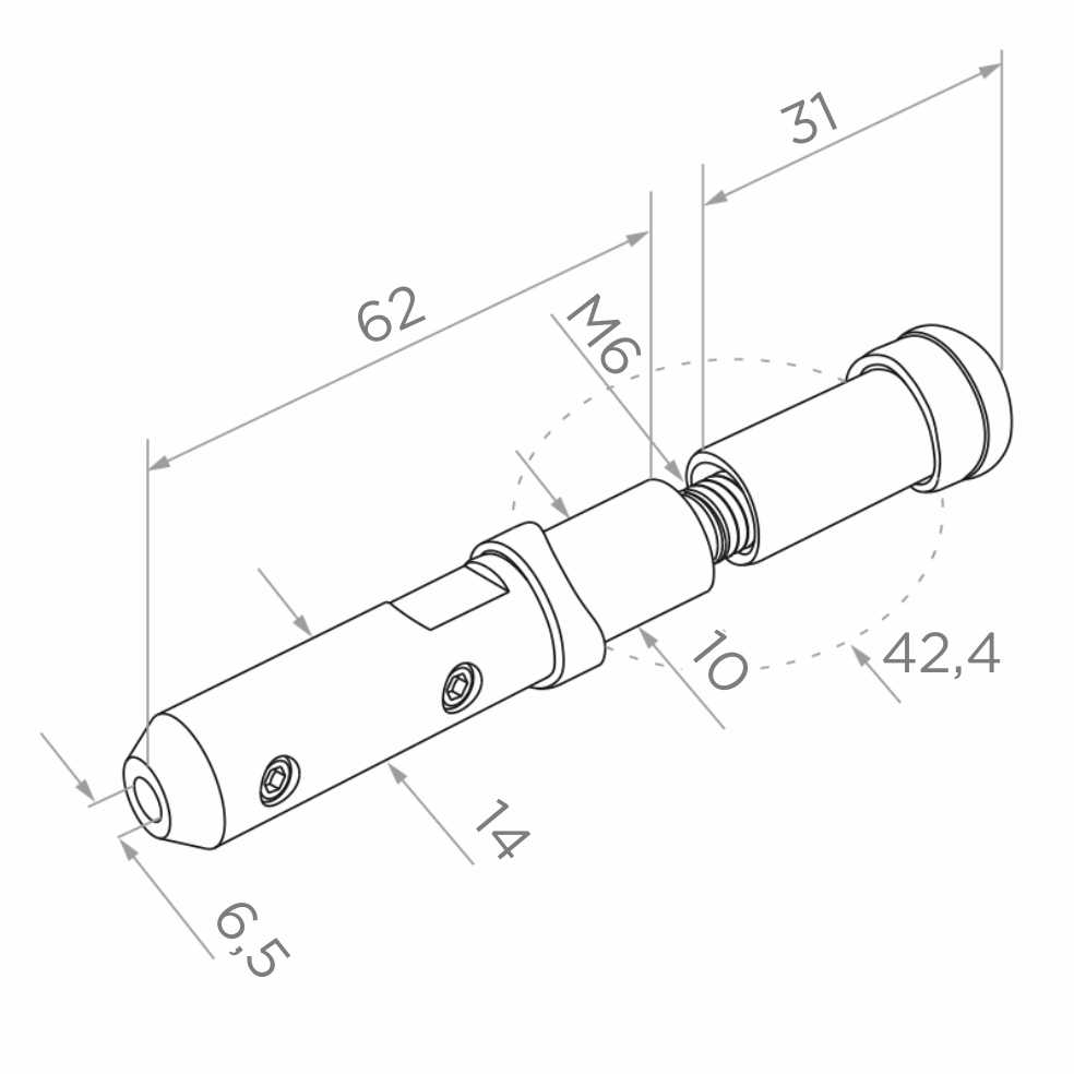 Support terminal (de départ) pour câble ø 6 mm destiné au montage dans les systèmes de balustrades à câbles en acier. Élément monté sur le poteau d'extrémité de la balustrade (tube Ø 42,4 mm) ou directement sur une surface plane, par exemple un mur — utilisation universelle en un seul produit. Grâce à sa construction vissée avec filetage M6, le support ne nécessite pas de soudage, ce qui réduit considérablement le temps de montage et élimine la nécessité d'utiliser une soudeuse sur le chantier.