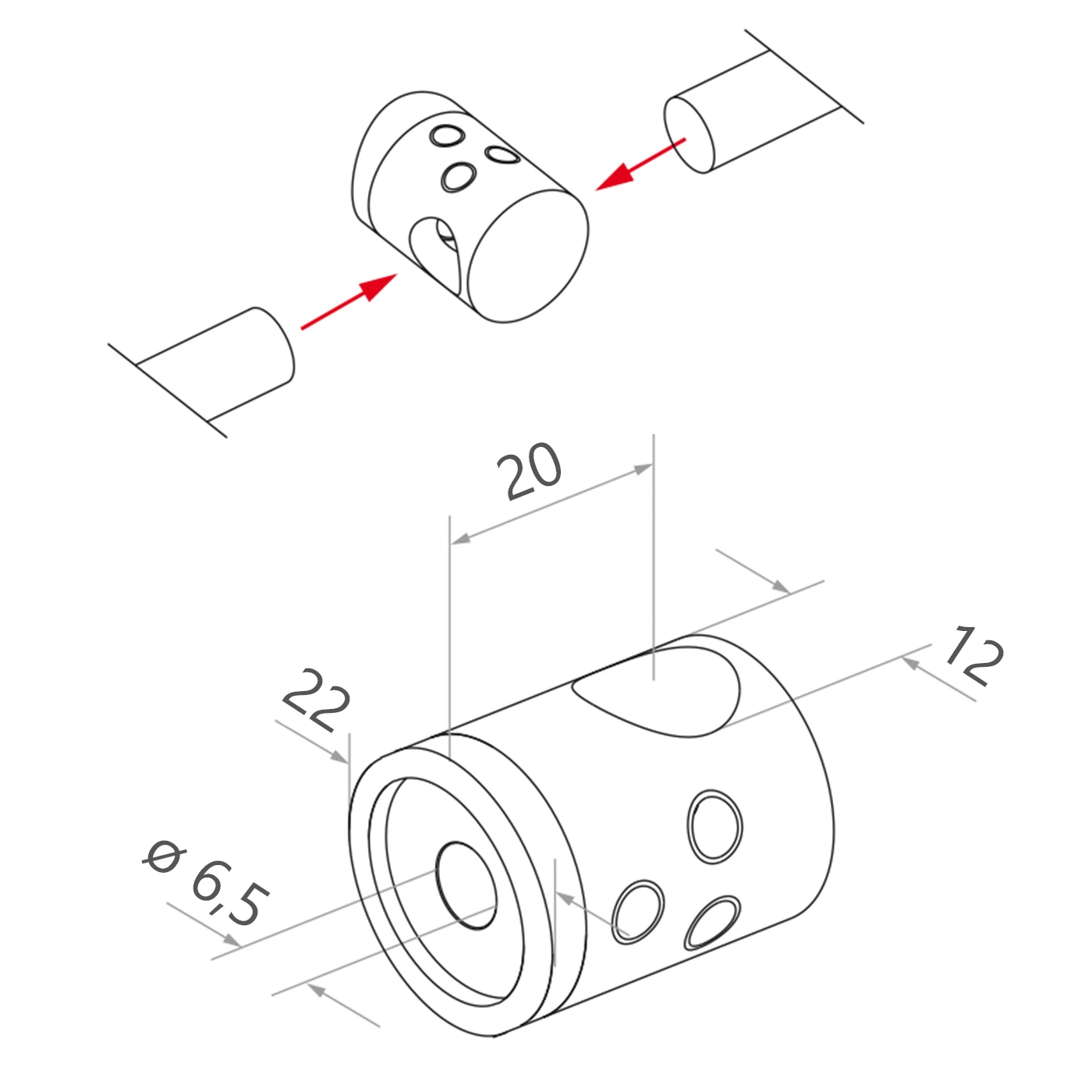 Le support traversant est destiné aux systèmes de balustrades avec remplissage à tiges ou tubes. Il est monté directement sur une surface plane — poteau, profilé ou tôle — au moyen du trou axial ø 6,5 mm. La tige d'un diamètre de ø 12 mm passe à travers l'orifice transversal, ce qui assure une répartition uniforme des charges et élimine les jeux. L'acier inoxydable AISI 304 garantit une haute résistance à la corrosion, permettant à l'élément de convenir aussi bien aux applications intérieures qu'extérieures.