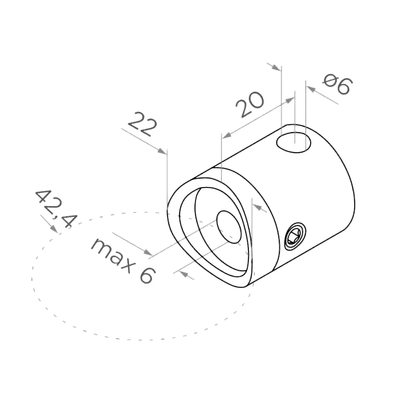 Support traversant pour câble ø 6 mm destiné au montage sur poteau en tube de diamètre 42,4 mm. Élément compact utilisé dans les garde-corps inox avec remplissage par câble en acier — permet de faire passer facilement le câble à travers le poteau et de le fixer solidement à l'aide d'une vis de serrage.