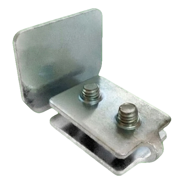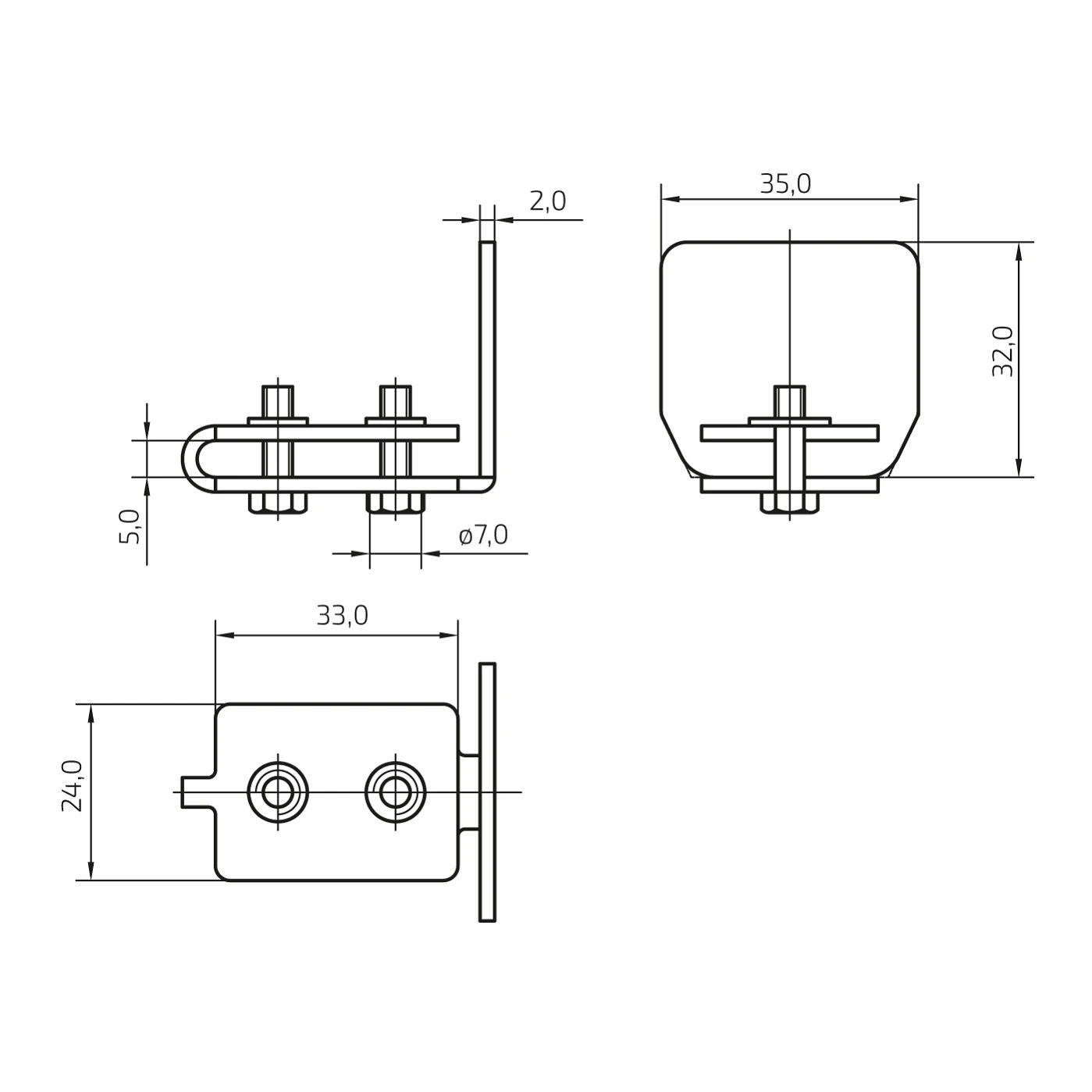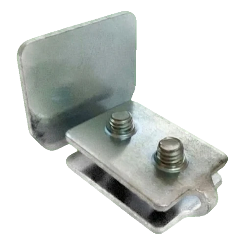 L'élément se compose d'une tôle frontale verticale aux dimensions 35 × 32 mm et d'une partie horizontale coulissante dans le profil du rail, fixée par deux vis incluses dans l'ensemble. Le montage est rapide et ne nécessite pas d'outils spécialisés supplémentaires — il suffit de glisser l'élément dans le rail et de serrer les vis.