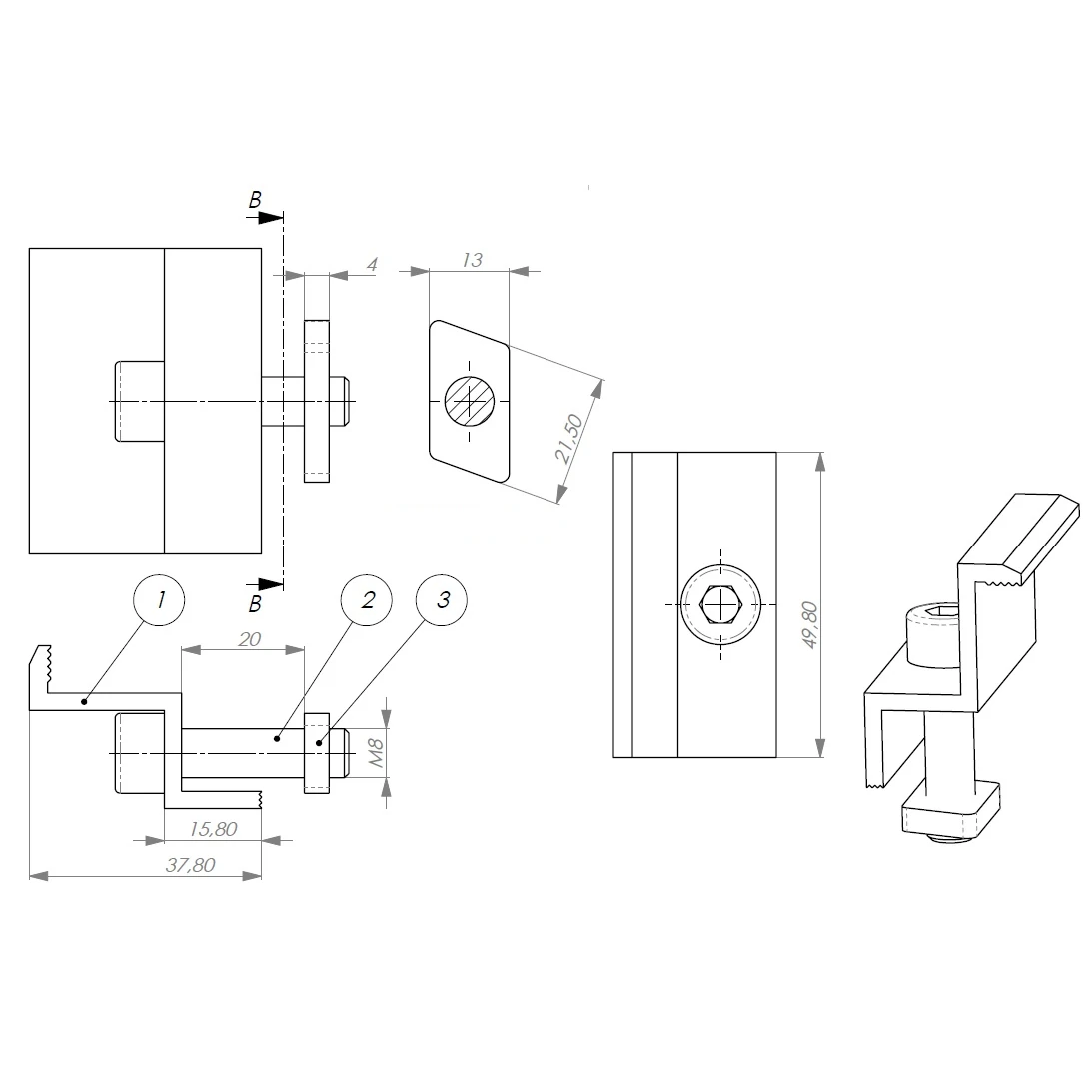 Collier de serrage latéral 35mm avec vis et insert en aluminium 6060, peint en noir, pour le montage de modules photovoltaïques de 35mm avec vis DIN 912 M8x25.