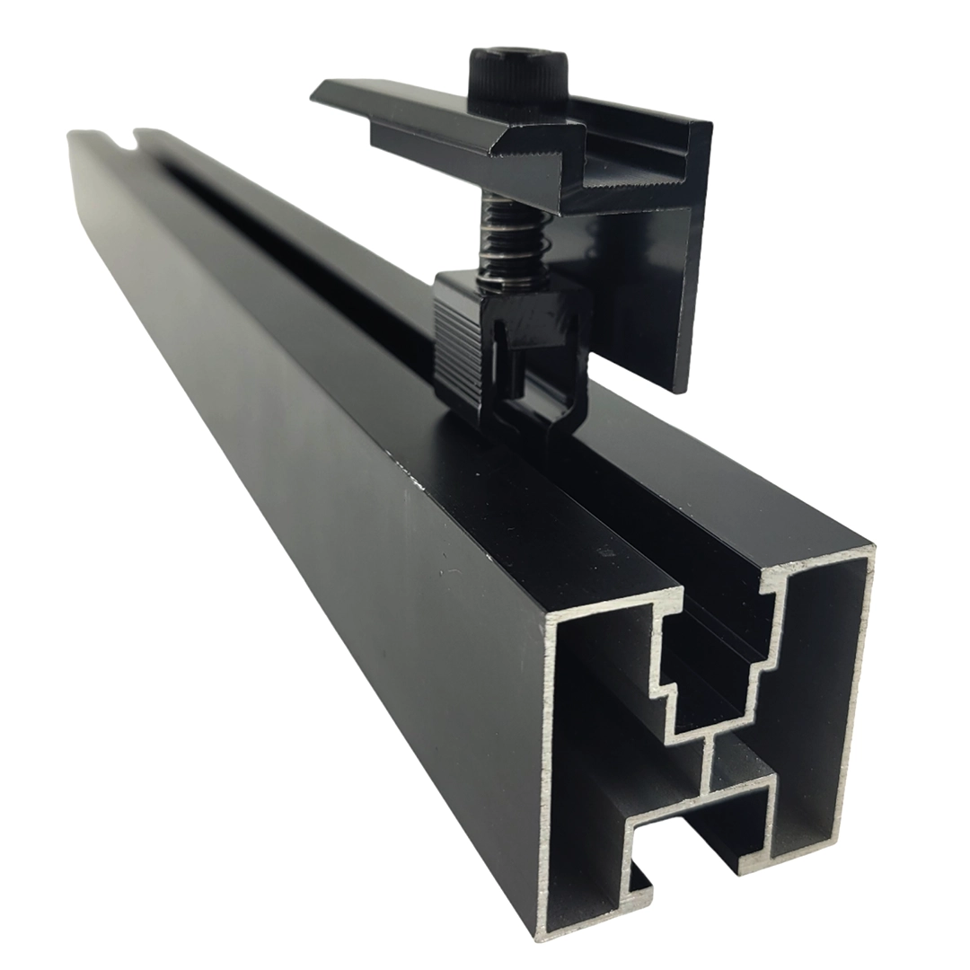 Le système CLIC permet un montage rapide — le clip s'insère dans la rainure du profilé à n'importe quel endroit. Le serrage de la vis écarte le clip et plaque le panneau contre le profilé. Les dentelures situées sous la pince s'accrochent au cadre, empêchant tout déplacement du module.