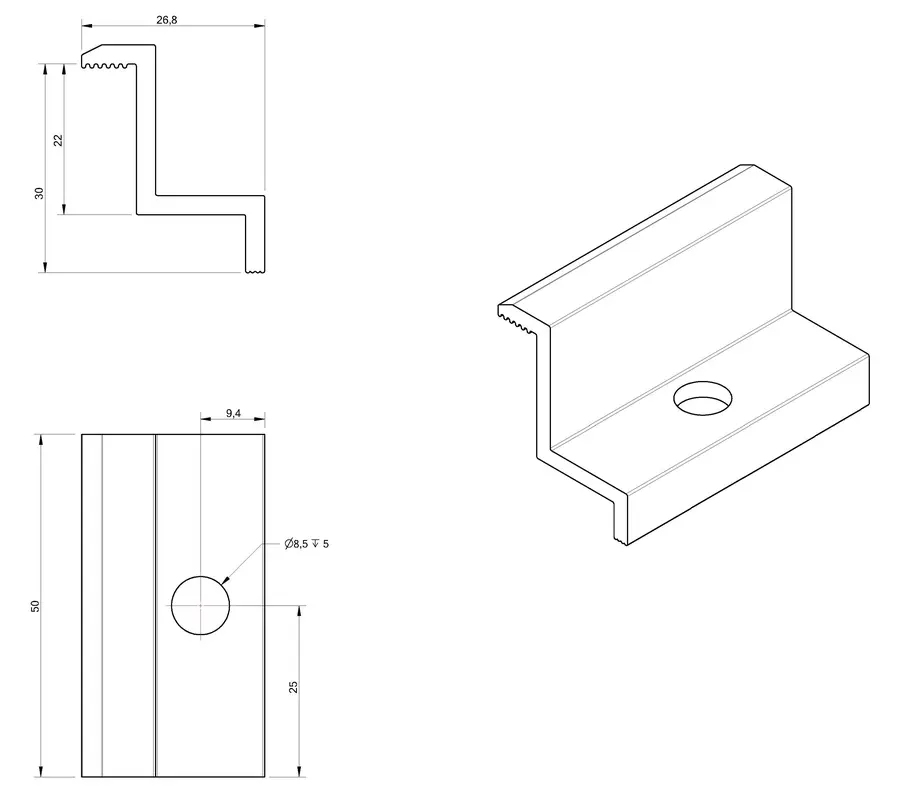 Collier de serrage latéral en Aluminium 6060 Anodisé, 30mm, trou M8, pour modules photovoltaïques.