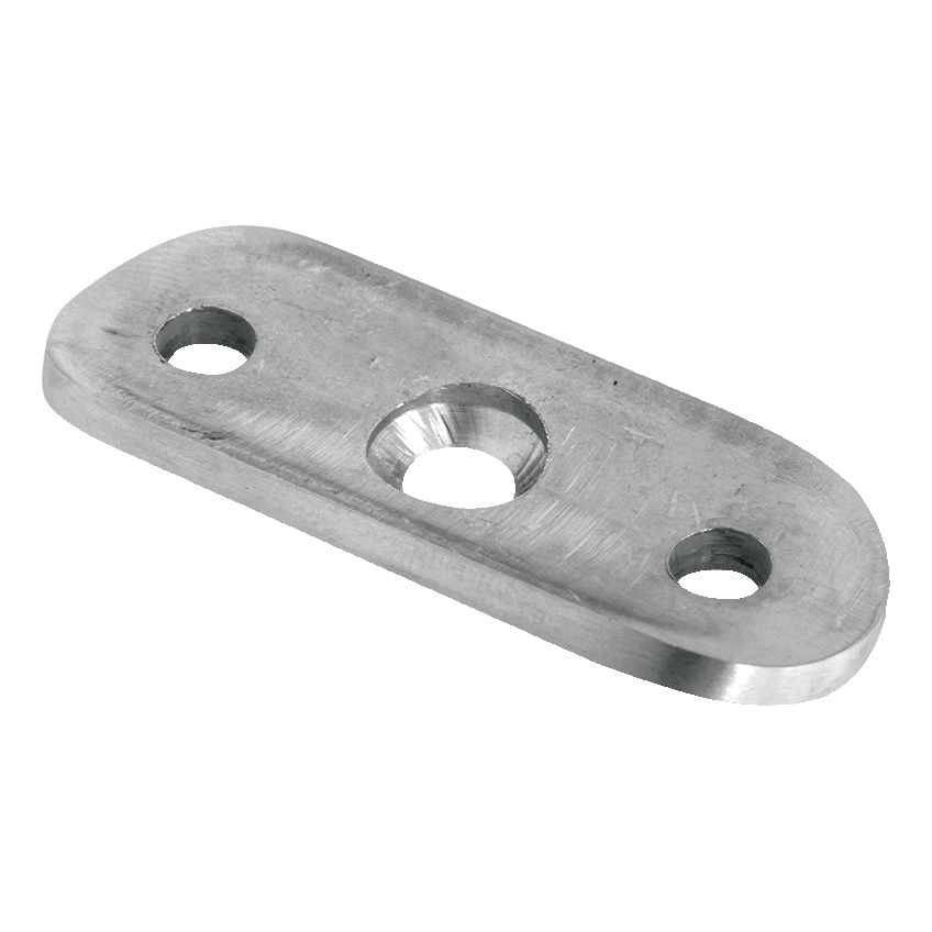 Plaque de montage pour main courante destinée au système de balustrade Ø 48,3 mm. Permet un montage rapide et sûr de la main courante par le haut, directement sur une surface plane – par exemple sur un montant de balustrade ou un autre élément porteur. Trois trous de montage (deux extérieurs chanfreinés pour vis à tête conique et un central) assurent une fixation stable à trois points et un aspect esthétique de la connexion.