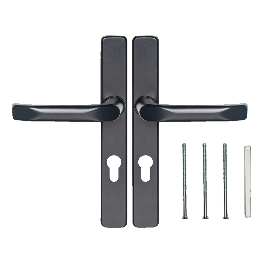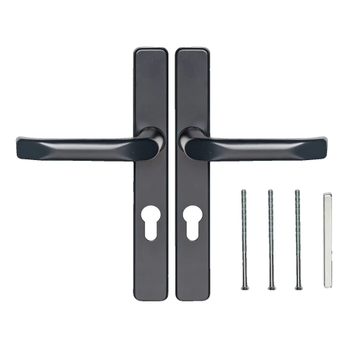 L'ensemble est destiné aux portes équipées d'une serrure avec cylindre européen (perçage PZ visible sur la rosace). Le montage s'effectue à l'aide des vis traversantes incluses — le cache rectangulaire couvre esthétiquement les têtes de vis, assurant un aspect propre et moderne de la ferrure.