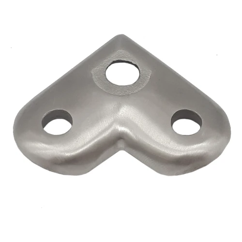 La plaque est destinée à fixer les supports de main courante sur les angles — là où la course de la balustrade change de direction. Le montage s'effectue en vissant la plaque par le haut sur une surface plane (par ex. un poteau ou un pilier porteur). Trois trous de montage assurent une fixation sûre à trois points et éliminent le risque de rotation de l'élément sous charge.