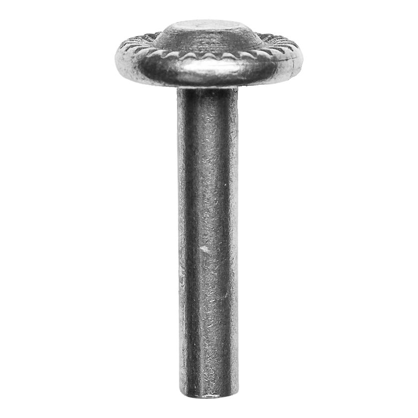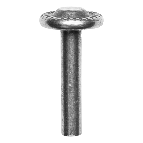 Rivet décoratif en acier Postal destiné à l'assemblage permanent et indémontable d'éléments de constructions métalliques avec fonction décorative simultanée. Grâce à la rondelle crantée de la tête, le rivet s'ancre solidement dans le matériau et donne à la construction finie un caractère esthétique forgé — idéal pour les portails d'entrée, portillons, panneaux de clôture et balustrades.