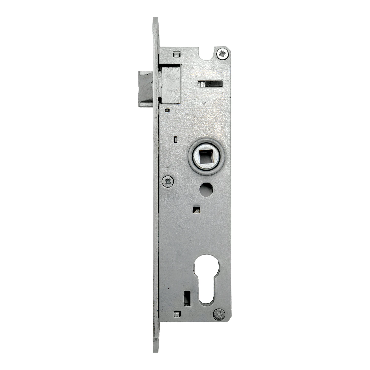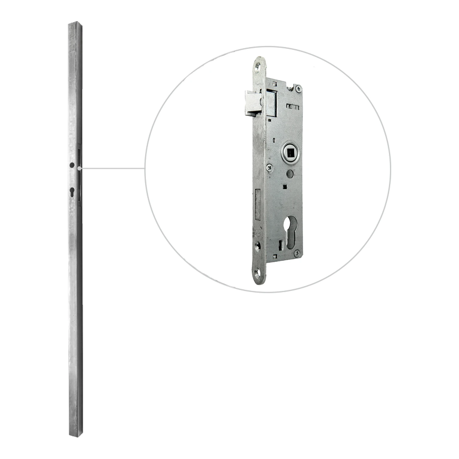 Le boîtier intégré dans le poteau remplit une double fonction – il dissimule le mécanisme de la serrure et le protège des intempéries simultanément. La serrure est compatible avec un cylindre à barillet standard et une poignée à carré de 8 mm, ce qui assure une compatibilité totale avec les quincailleries courantes disponibles sur le marché.