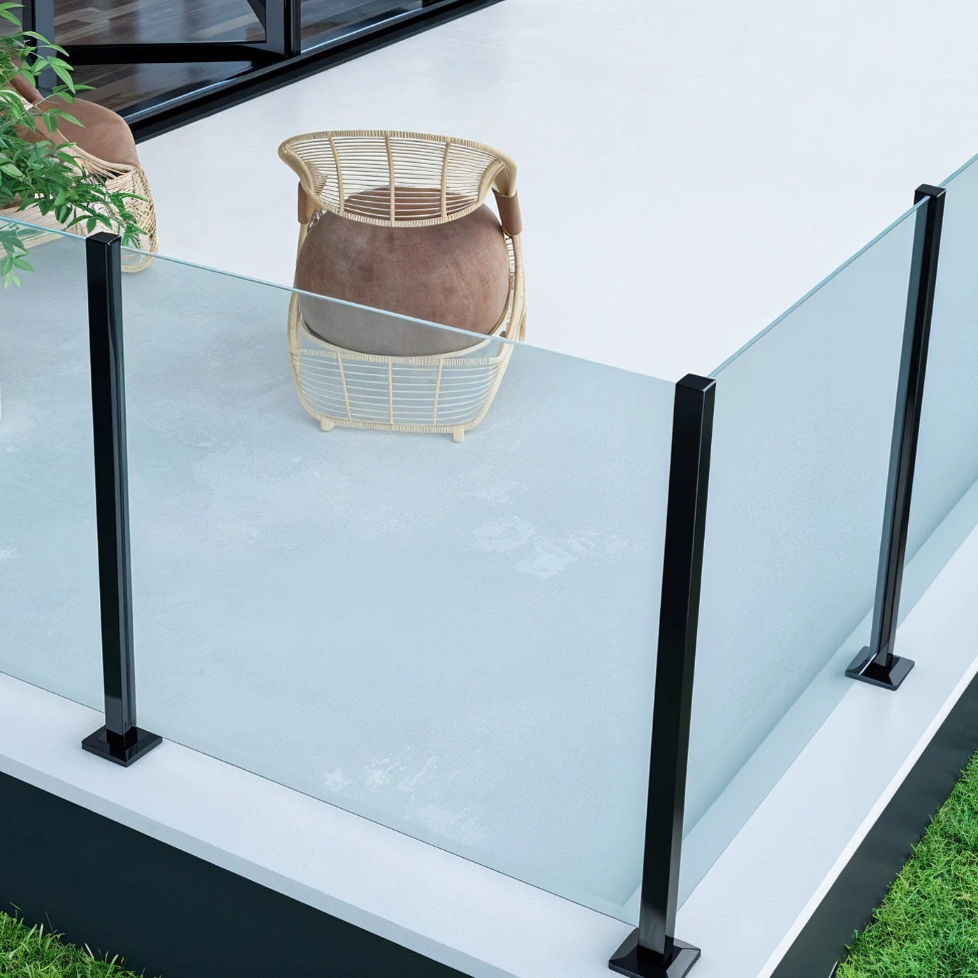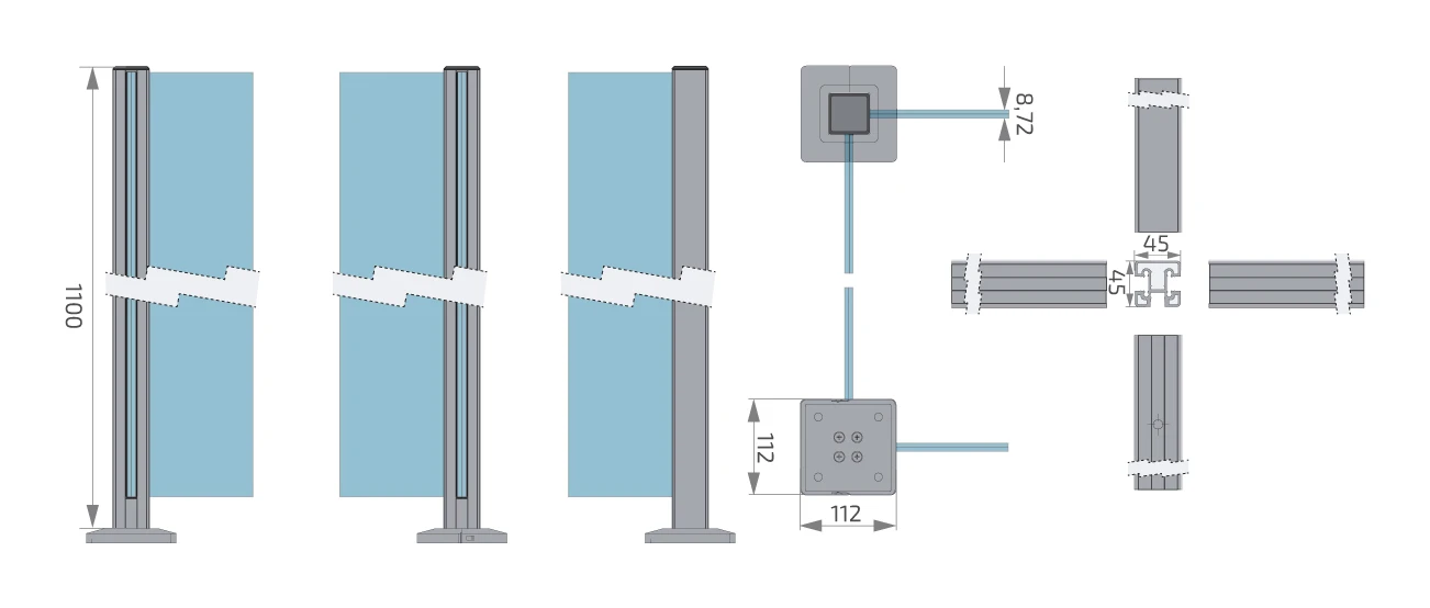 Le profilé de section 45×45 mm et de hauteur 1100 mm est destiné au verre feuilleté d'épaisseur 8,72 mm. Le système de montage au sol avec base plate 112×112 mm garantit la stabilité de la construction et permet un ancrage rapide dans le béton ou autre support porteur. La finition noire mate élégante obtenue par peinture en poudre assure la résistance aux conditions atmosphériques et donne aux balustrades un caractère moderne et minimaliste.