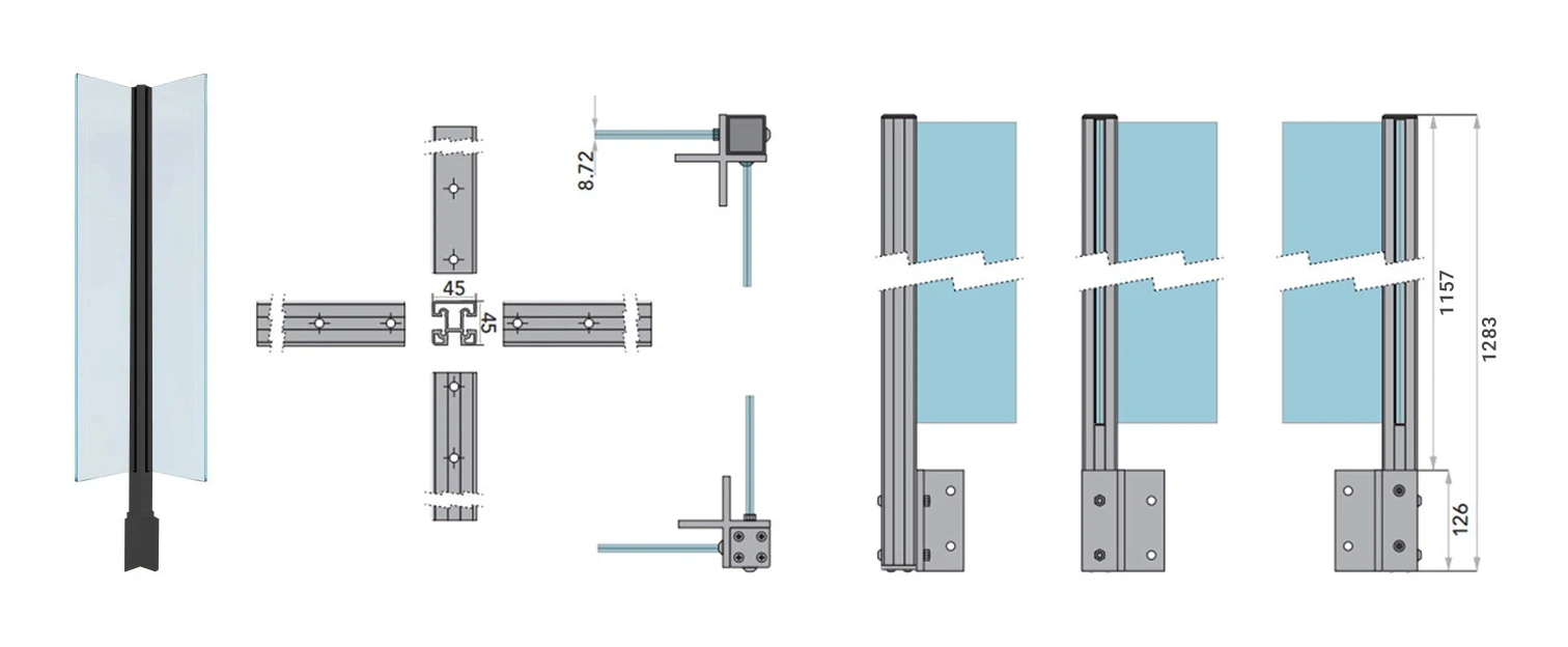- Variante de poteau : angle extérieur — guidage stable du verre en angle aux raccords