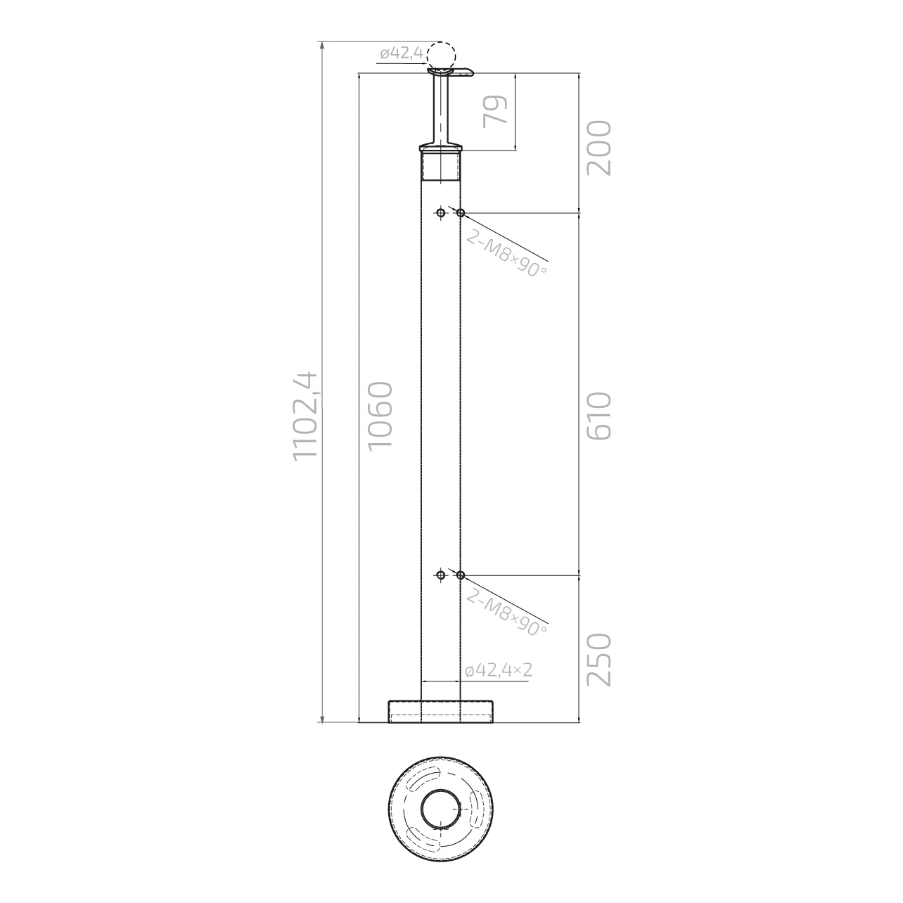 Le poteau se monte au sol et est destiné aux constructions d'angle à 90° — le support de main courante possède une platine de montage appropriément formée.